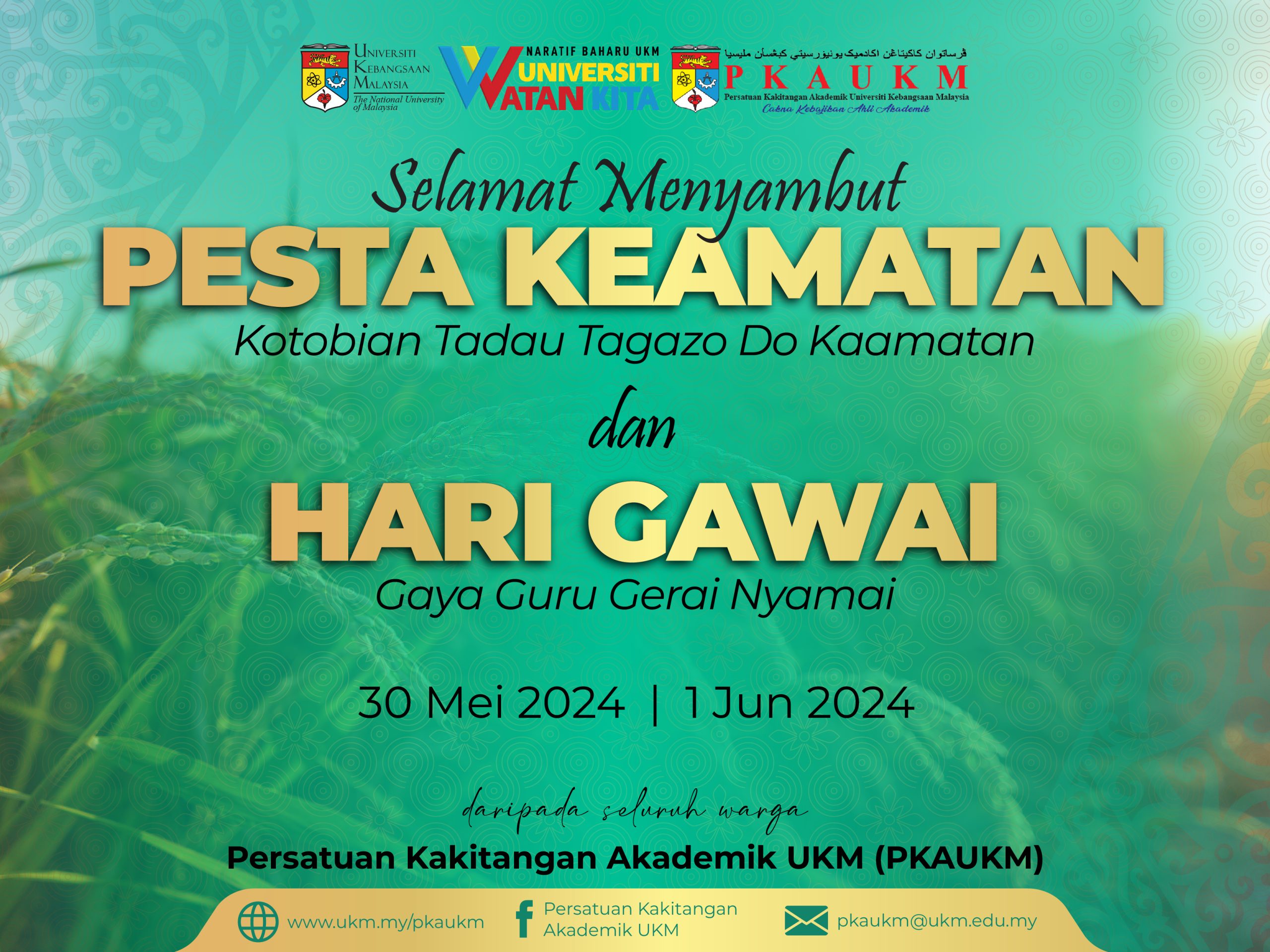 Persatuan Kakitangan Akademik UKM (PKAUKM) mengucapkan Selamat Menyambut Pesta Keamatan dan Hari Gawai 2024.