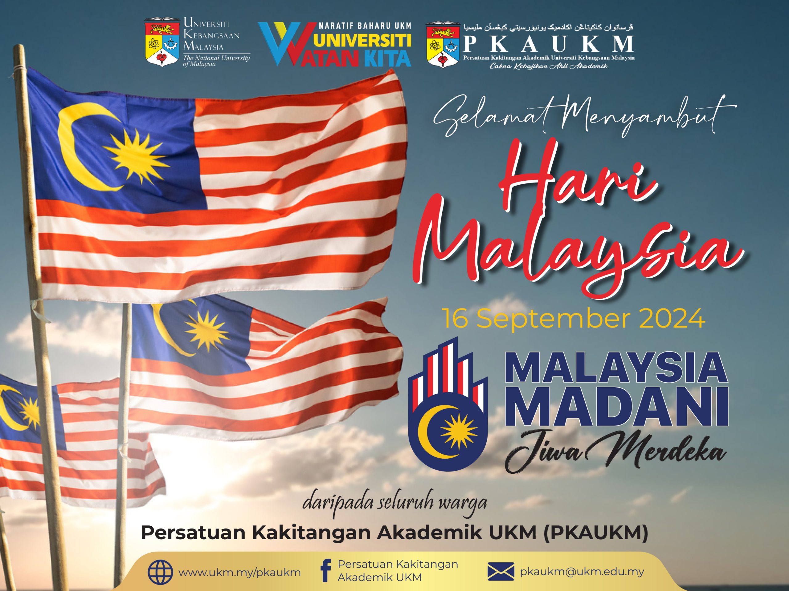 Persatuan Kakitangan Akademik UKM (PKAUKM) mengucapkan Selamat Menyambut Hari Malaysia. Malaysia Madani Jiwa Merdeka.