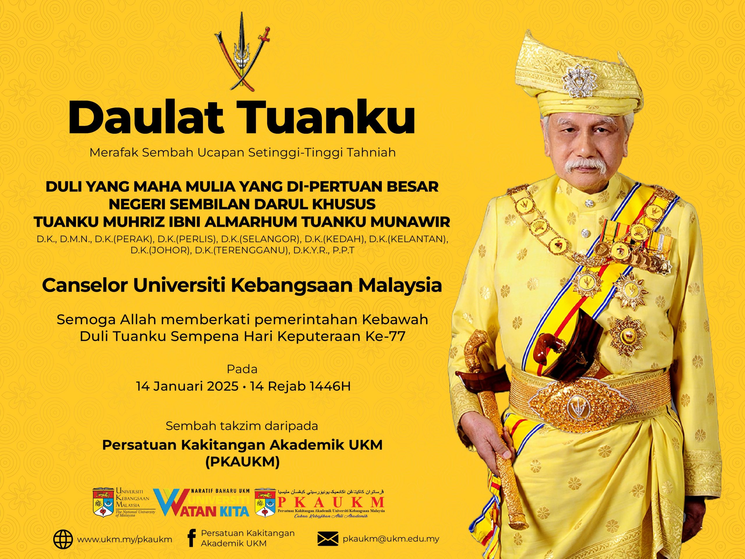 Merafak sembah dan setinggi-tinggi tahniah kepada Duli Yang Maha Mulia Yang di-Pertuan Besar Negeri Sembilan Darul Khusus, Tuanku Muhriz Ibni Almarhum Tuanku Munawir, Canselor Universiti Kebangsaan Malaysia (UKM).