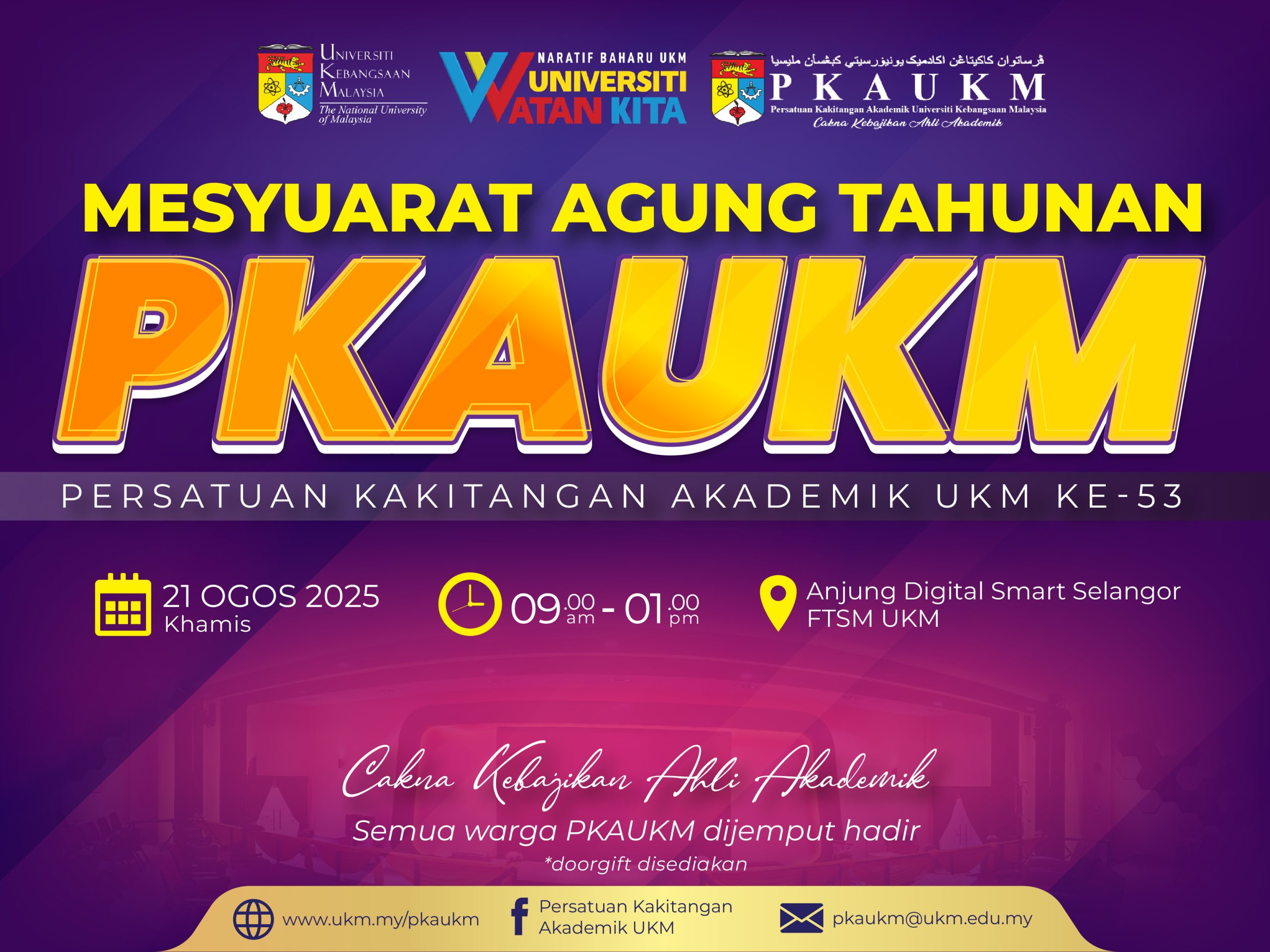 Untuk makluman Mesyuarat Agung Tahunan Persatuan Kakitangan Akademik UKM (PKAUKM) bagi tahun 2025 akan diadakan seperti berikut :-