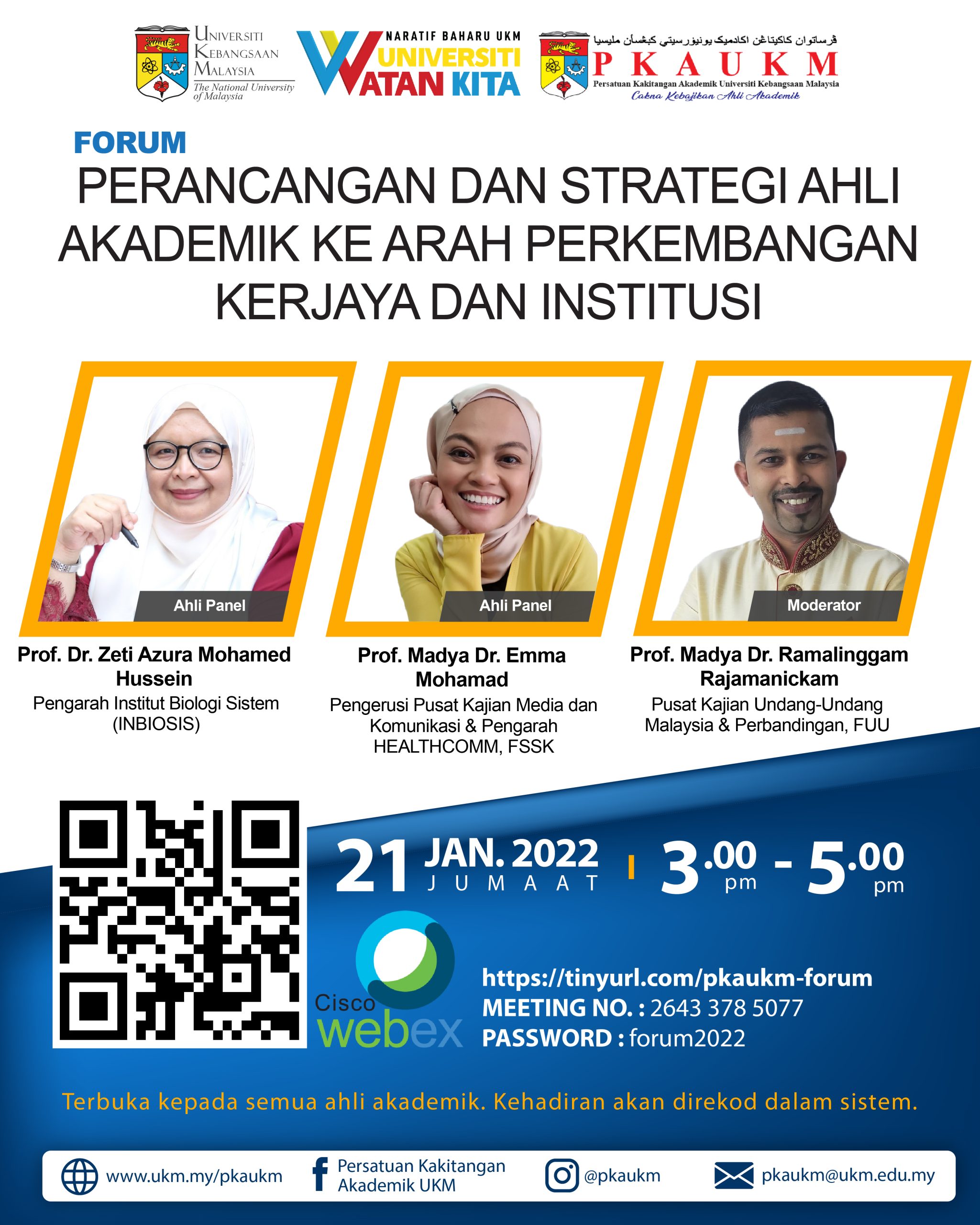 PKAUKM akan menganjurkan Forum “Perancangan dan Strategi Ahli Akademik ke Arah Perkembangan Kerjaya dan Institusi” seperti maklumat berikut : Tarikh: 21 Januari 2022 (Jumaat) Masa: …