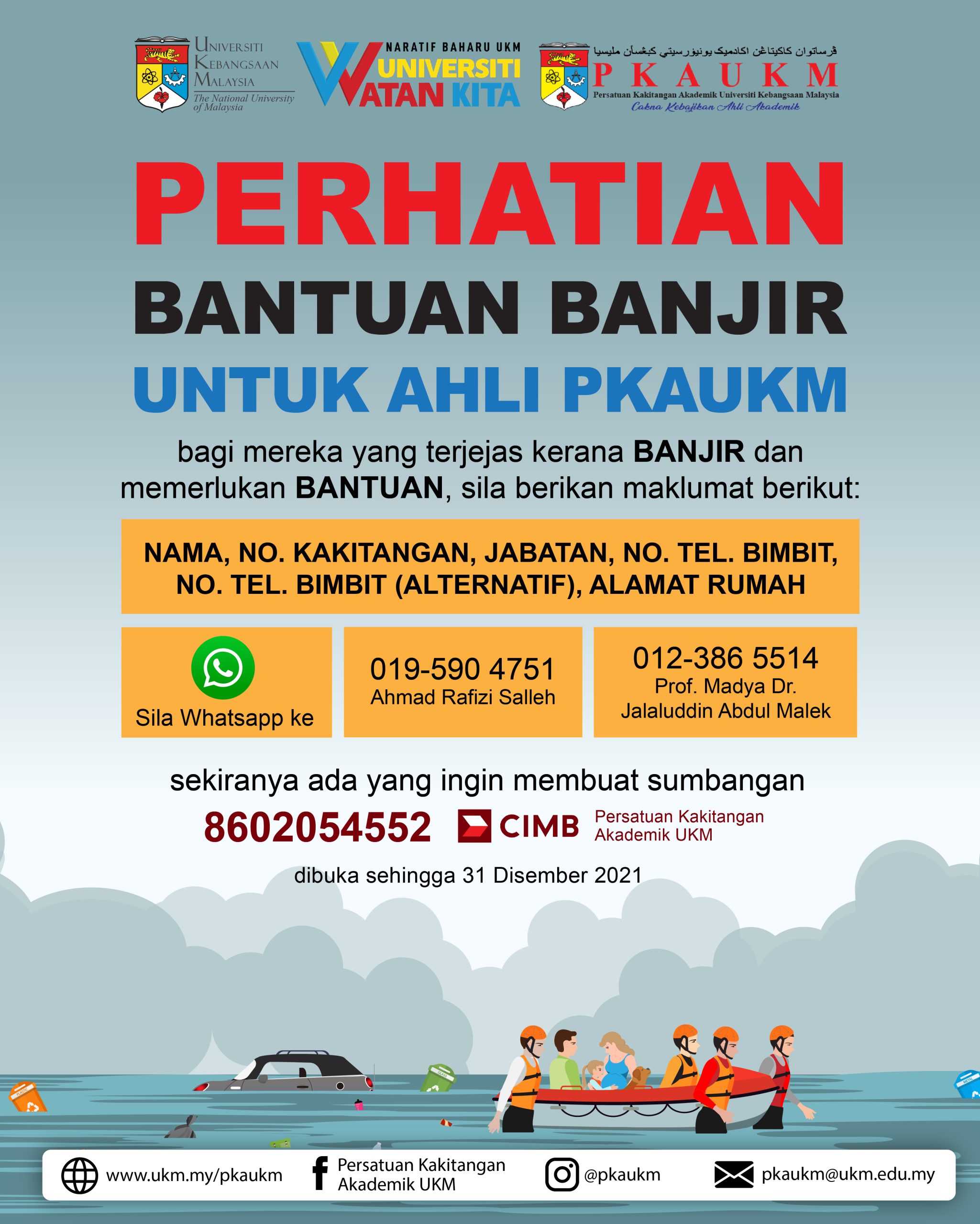 PERHATIAN!! BANTUAN BANJIR UNTUK AHLI PKAUKM bagi mereka yang terjejas kerana banjir dan memerlukan bantuan, sila berikan maklumat berikut: NAMA NO. KAKITANGAN JABATAN NO. TEL. …