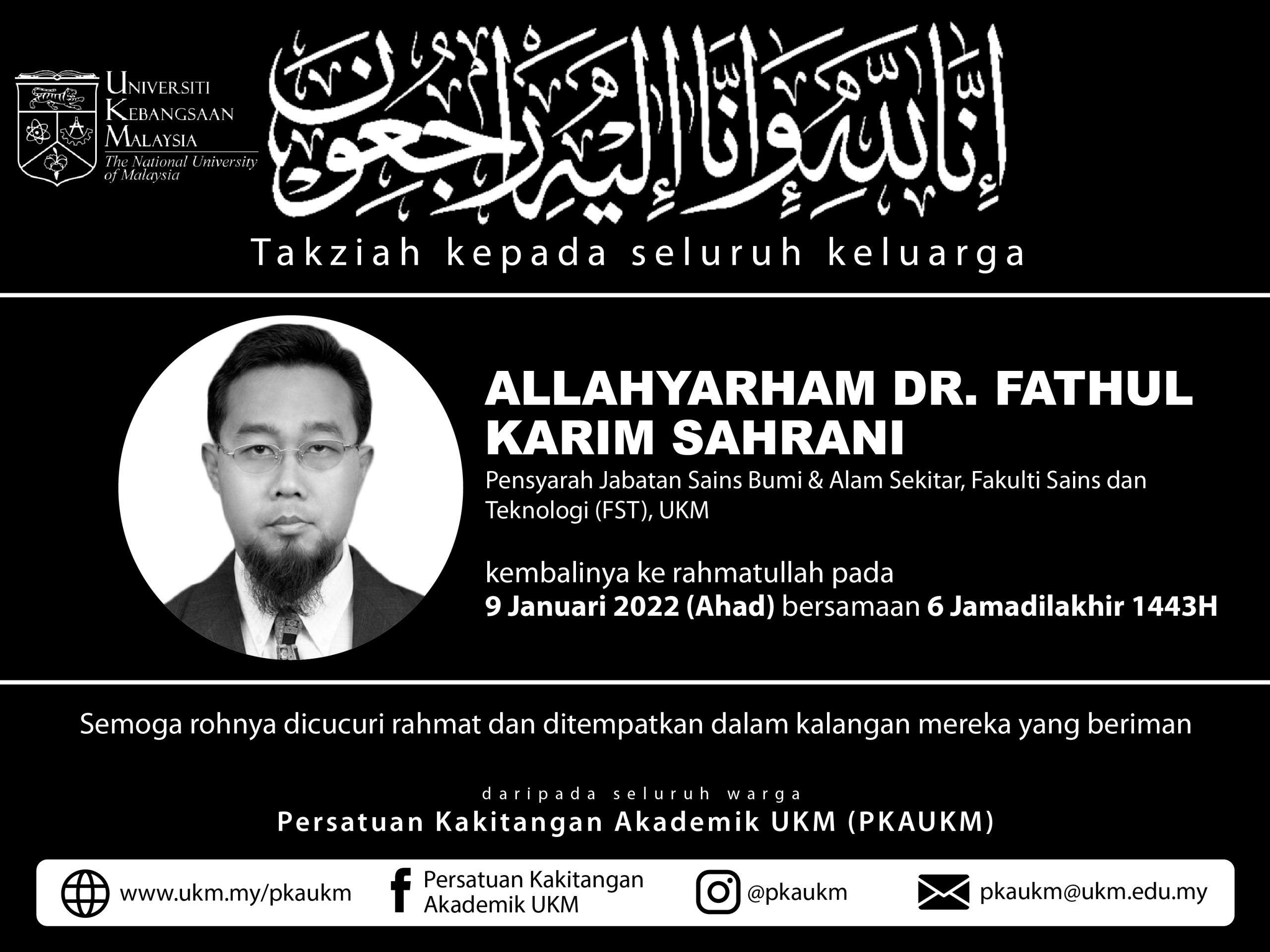 Innalillah wa innailaihirojiun. Dukacita dimaklumkan Dr. Fathul Karim Sahrani, pensyarah dari Fakulti Sains dan Teknologi (FST), UKM telah kembali ke Rahmatullah pada 9 Januari 2022 …
