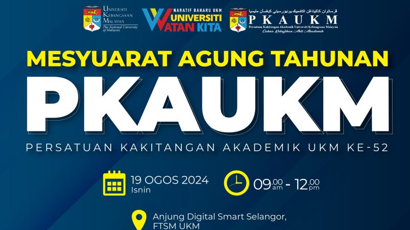 Mesyuarat Agung Tahunan PKAUKM yang ke-52 akan diadakan pada 19 Ogos 2024 bertempat di Dewan Anjung Digital Smart Selangor FTSM UKM. Semua warga PKAUKM dijemput …