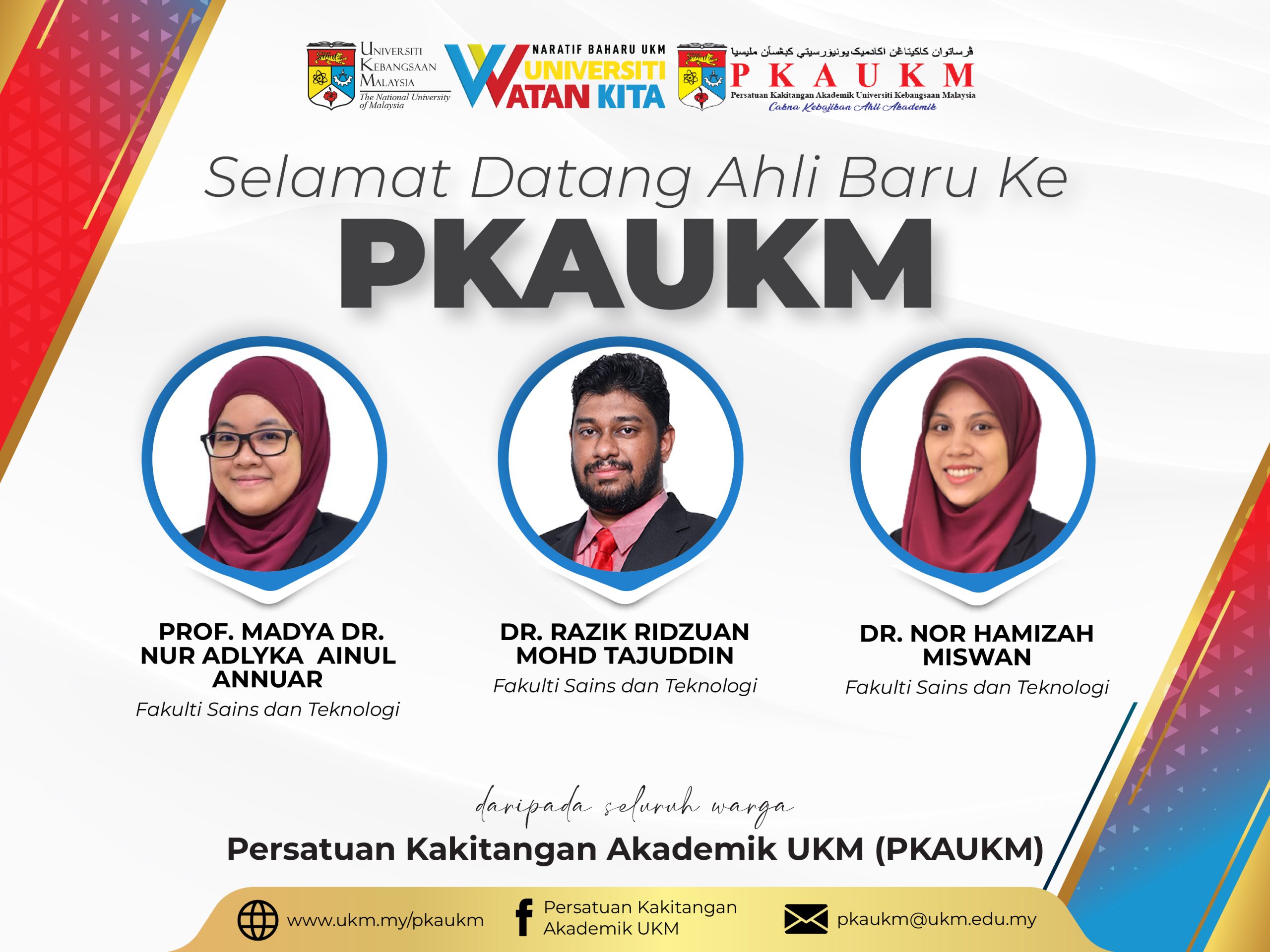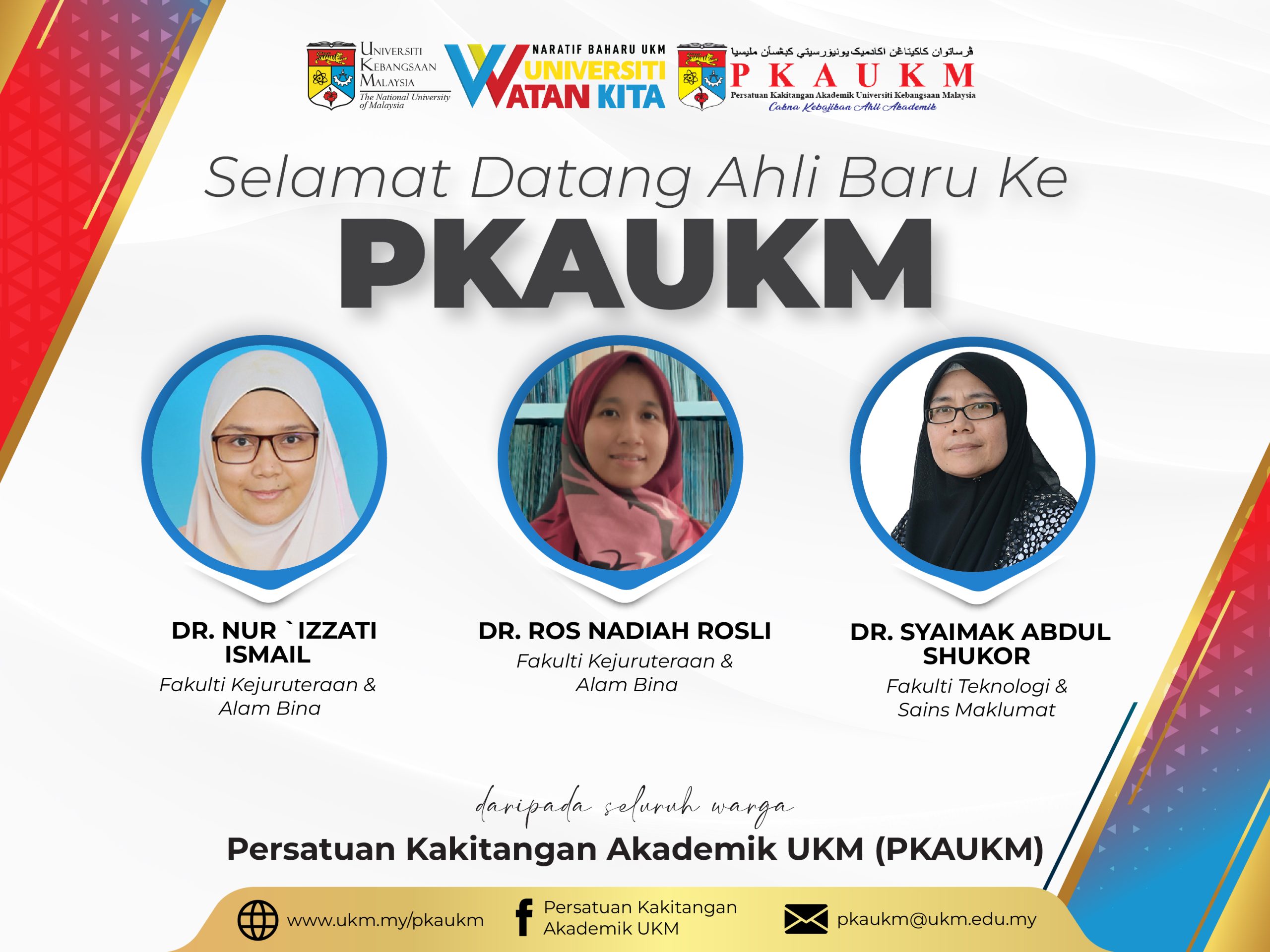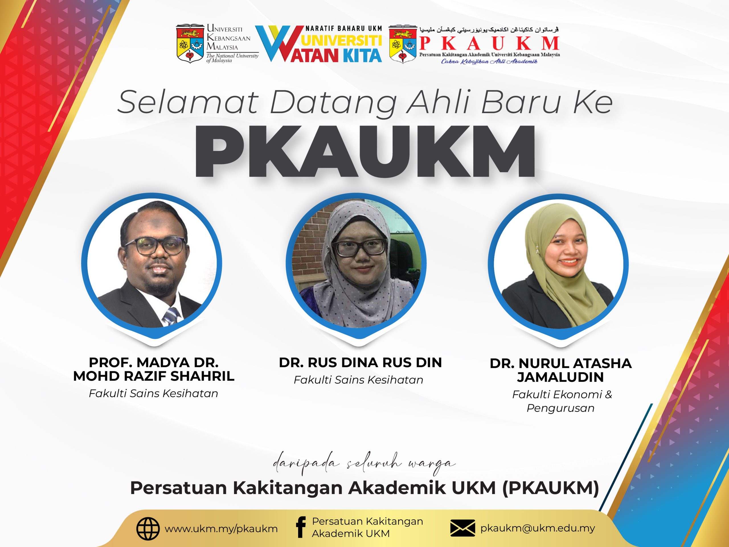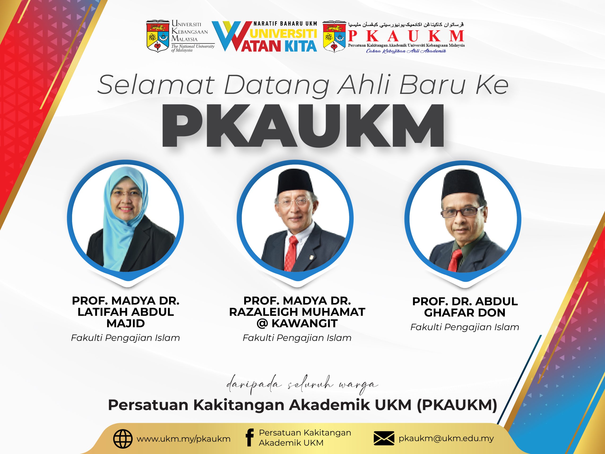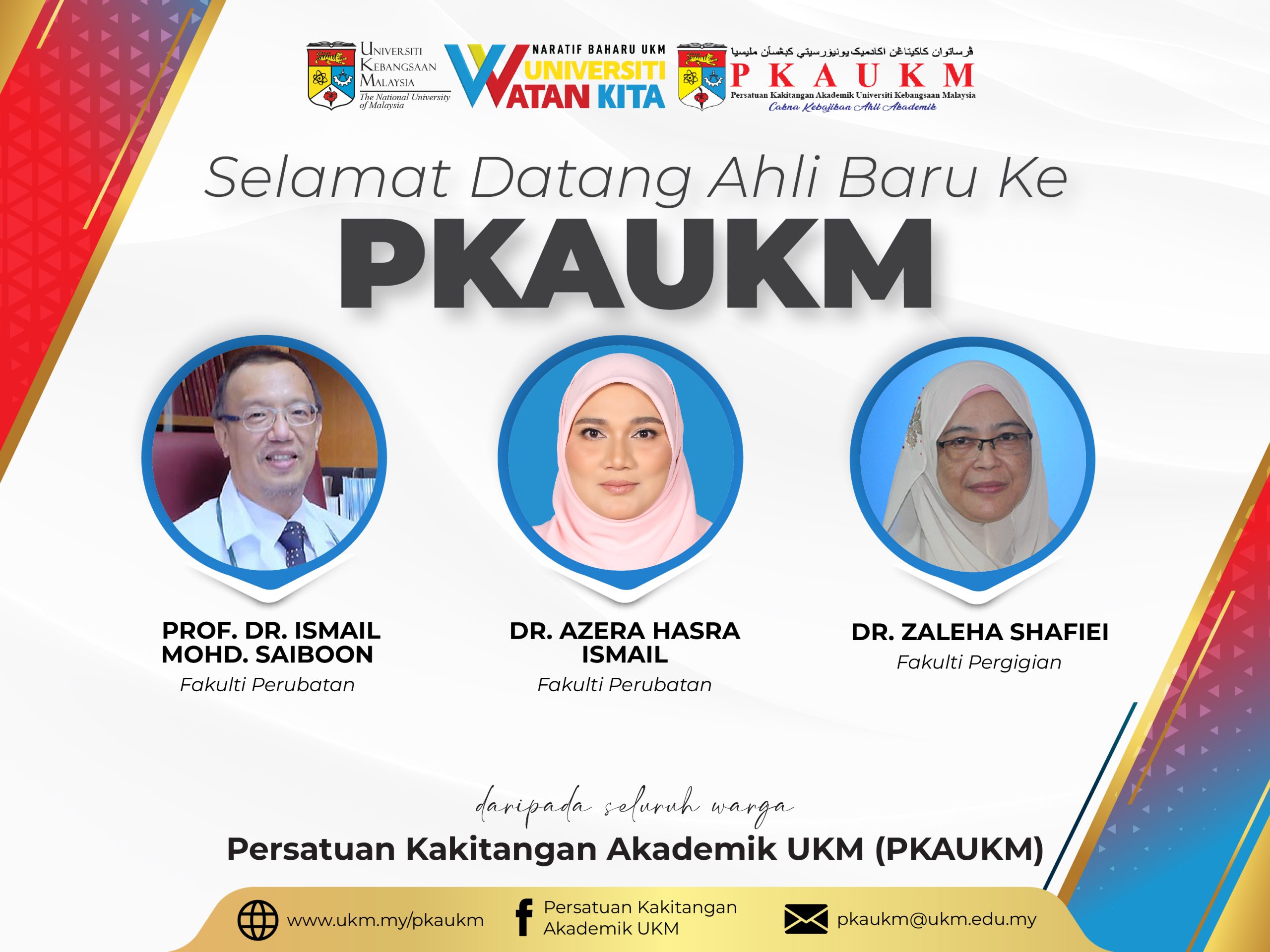Persatuan Kakitangan Akademik UKM (PKAUKM) mengucapkan SELAMAT DATANG kepada ahli-ahli baru. Semoga dengan penyertaan anda semua bersama persatuan ini akan terus bergerak maju dan cemerlang dalam pelbagai aspek.