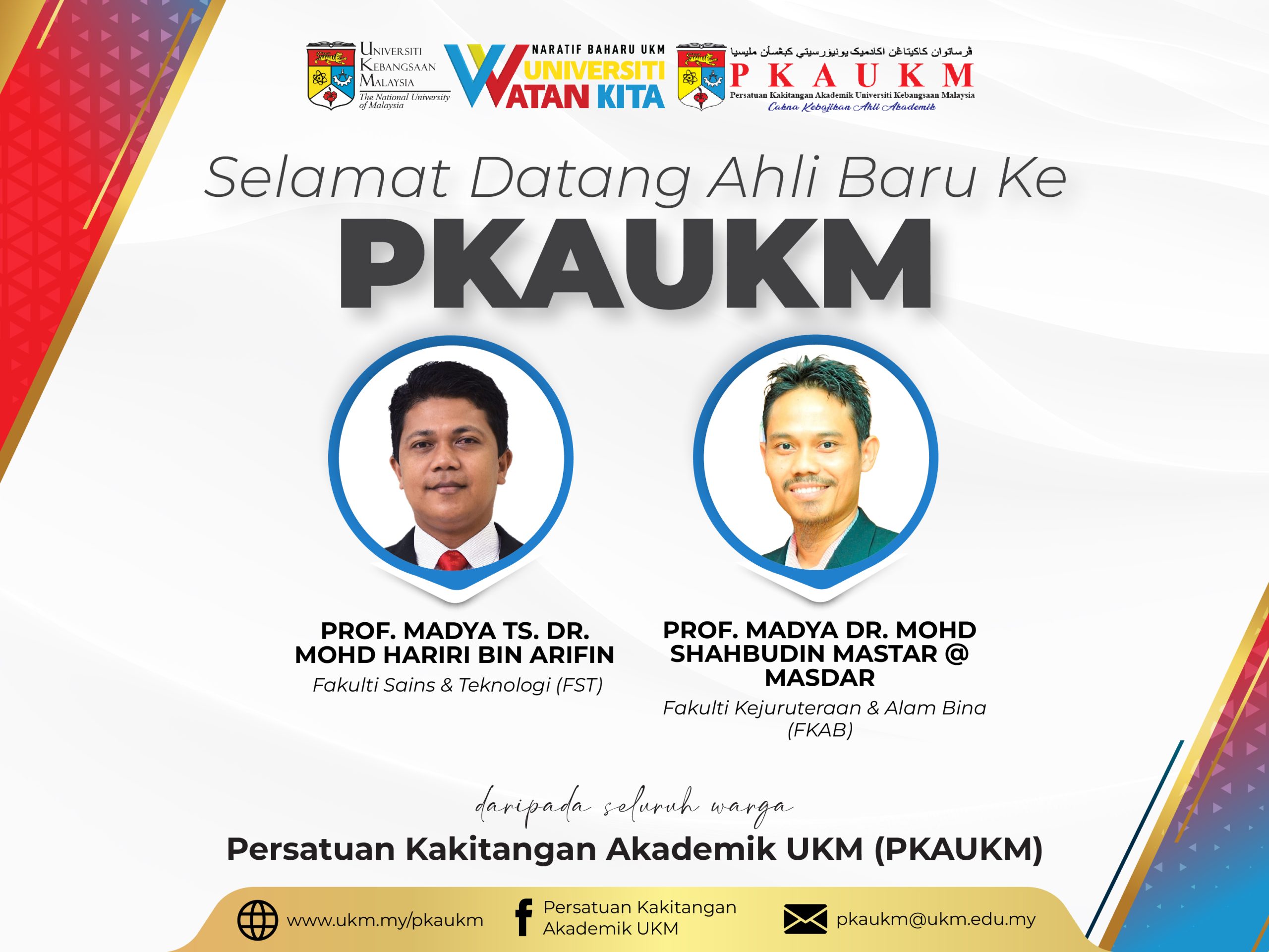 Persatuan Kakitangan Akademik UKM (PKAUKM) mengucapkan SELAMAT DATANG kepada ahli-ahli baru. Semoga dengan penyertaan anda semua bersama persatuan ini akan terus bergerak maju dan cemerlang.