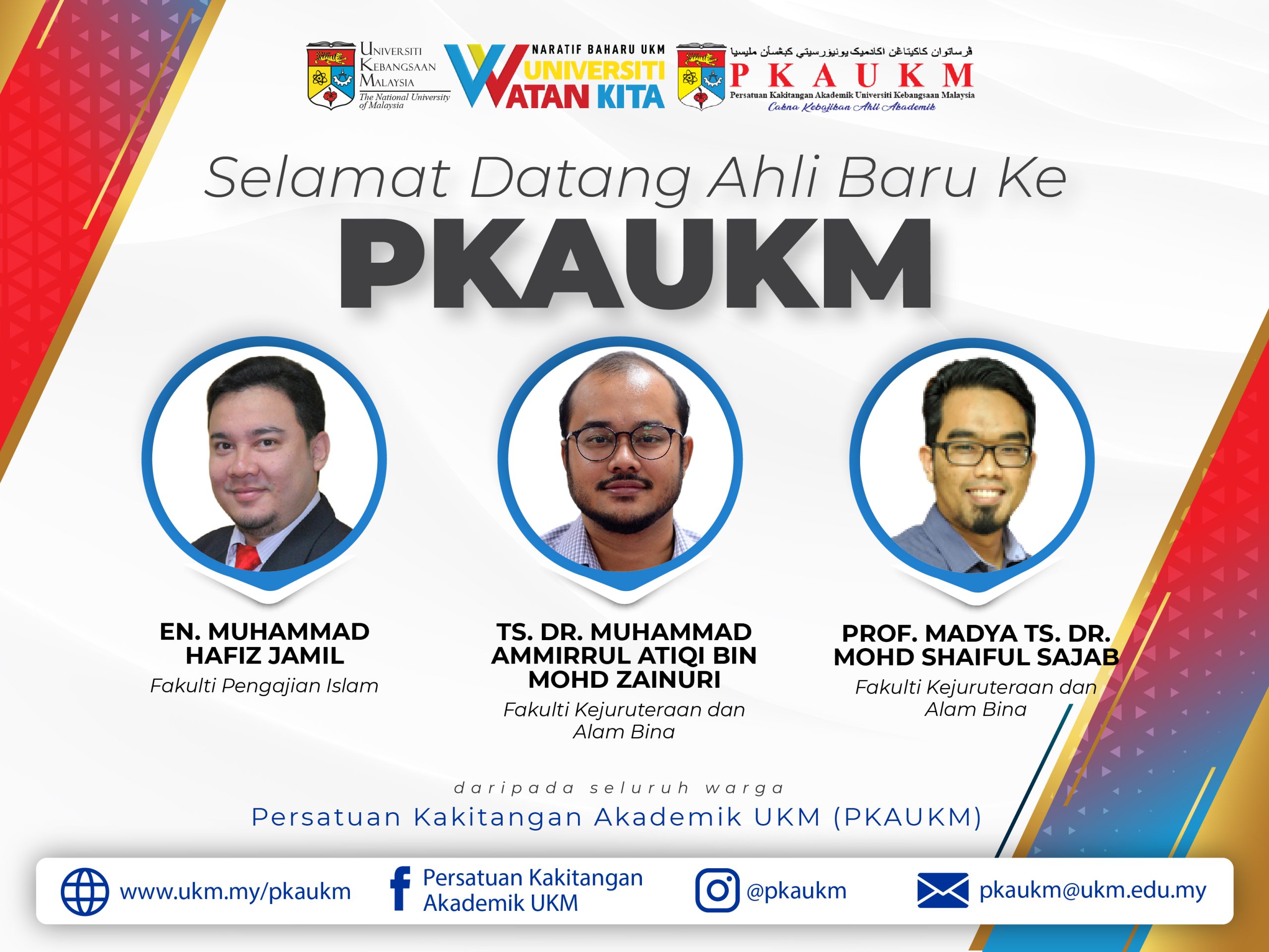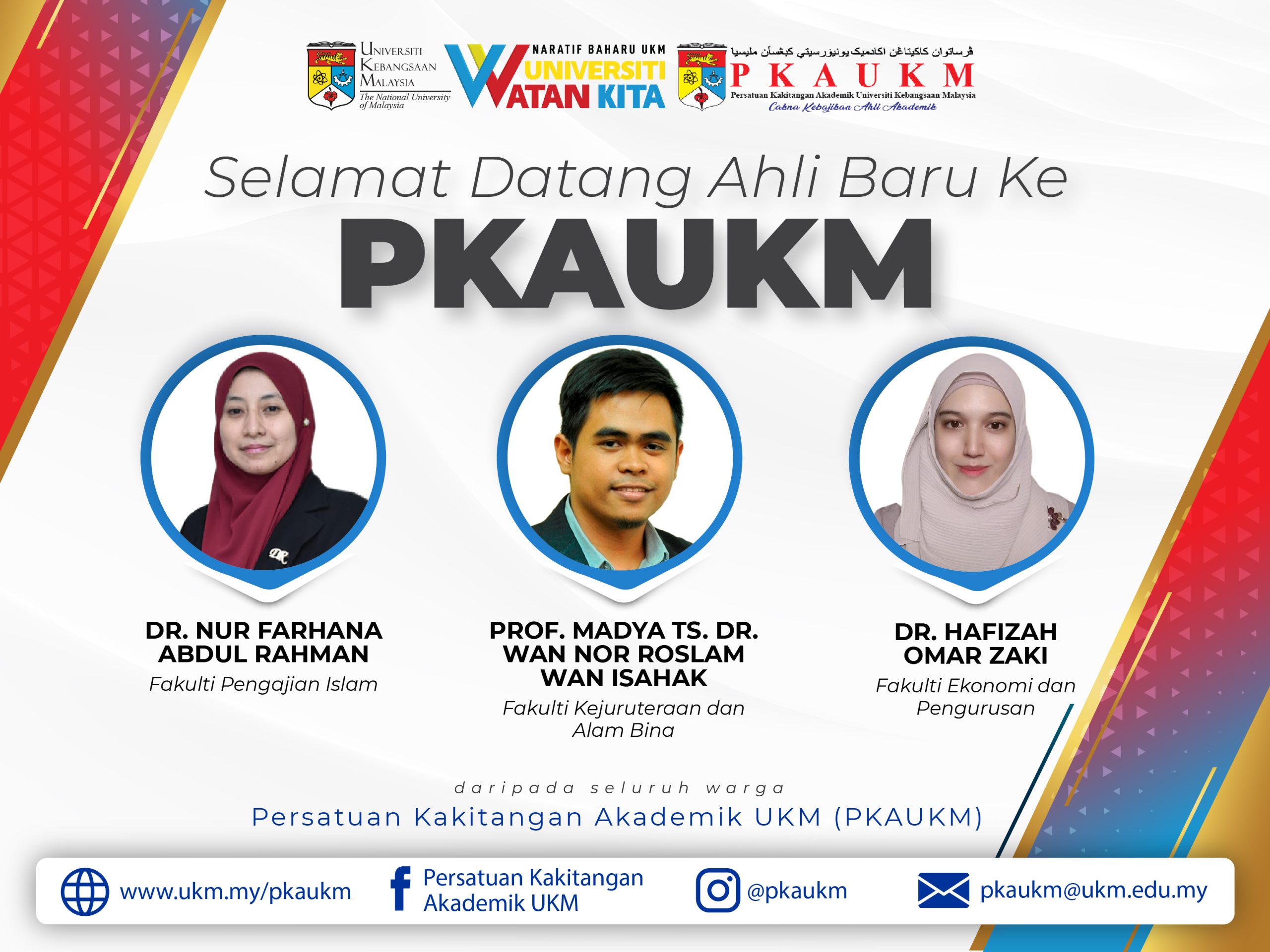 Persatuan Kakitangan Akademik UKM (PKAUKM) mengucapkan Selamat Datang kepada ahli-ahli baru. Semoga dengan penyertaan anda semua bersama persatuan ini akan terus bergerak maju dan cemerlang dalam pelbagai aspek.