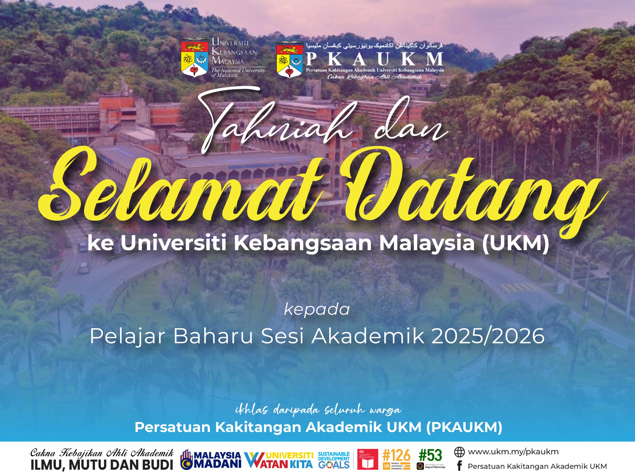 Persatuan Kakitangan Akademik UKM (PKAUKM) mengucapkan Selamat Datang kepada semua pelajar baharu ke Universiti Kebangsaan Malaysia (UKM) Sesi Akademik 2025/2026.