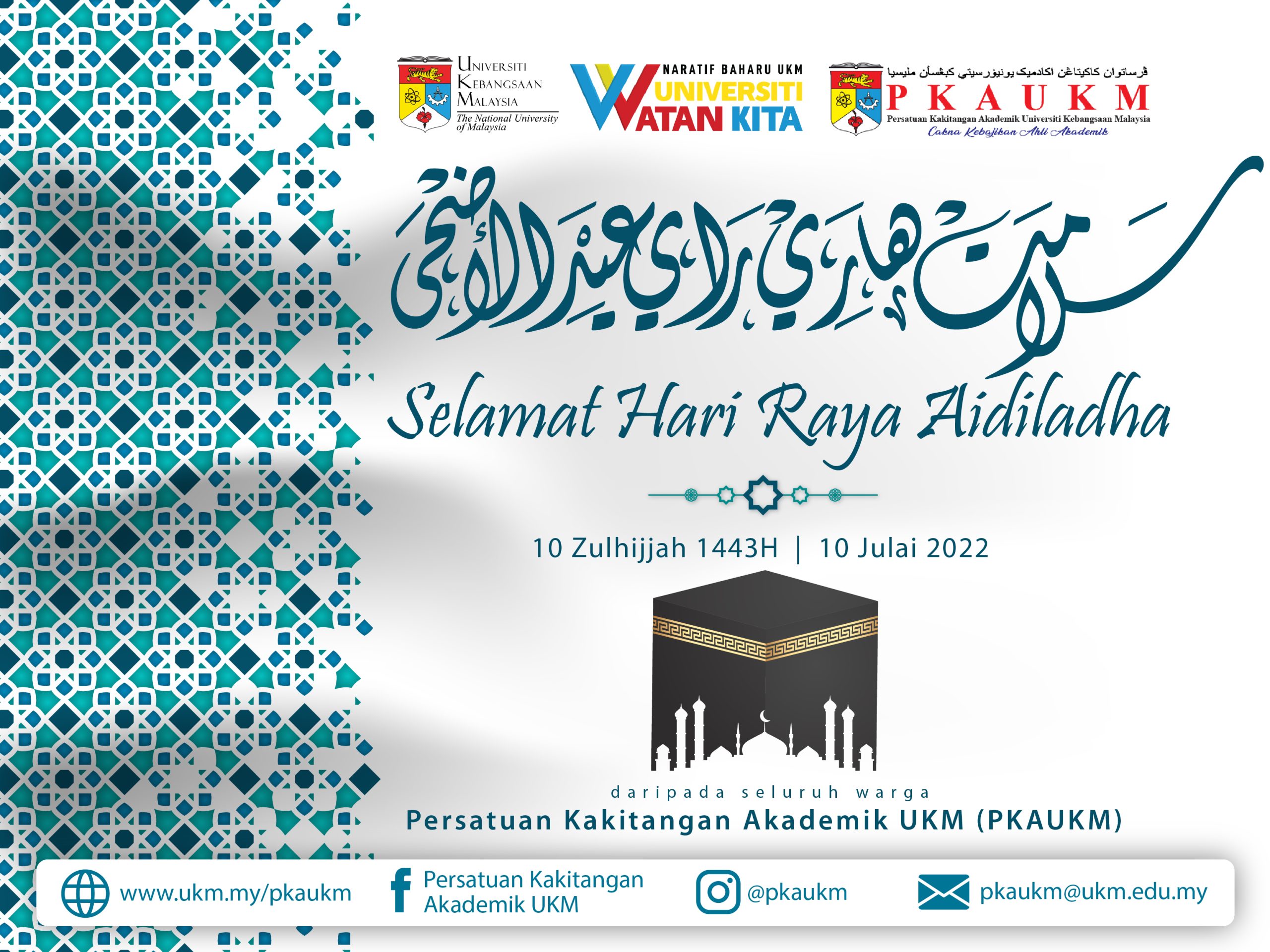 Persatuan Kakitangan Akademik UKM (PKAUKM) mengucapkan Selamat Menyambut Hari Raya Aidiladha 1443H.