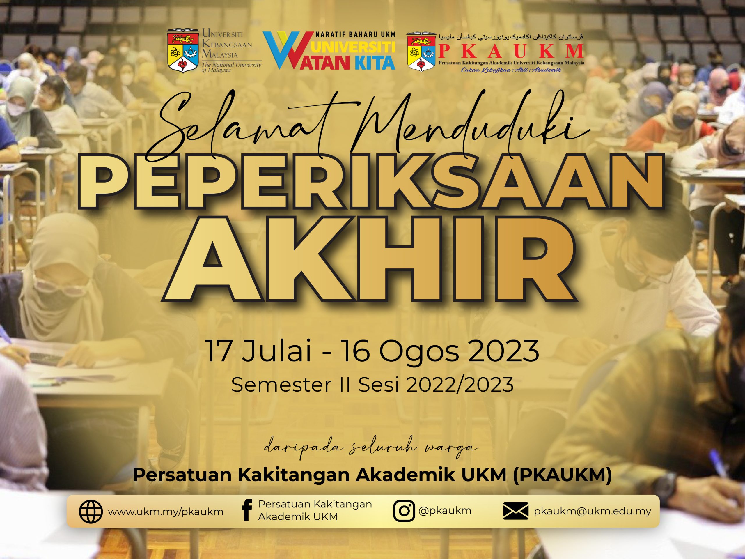 Persatuan Kakitangan Akademik UKM (PKAUKM) mengucapkan menjalani peperiksaan akhir bagi semester 2 sesi 2022/2023. Semoga anda semua memperoleh kejayaan untuk diri sendiri dan demi keluarga tercinta.