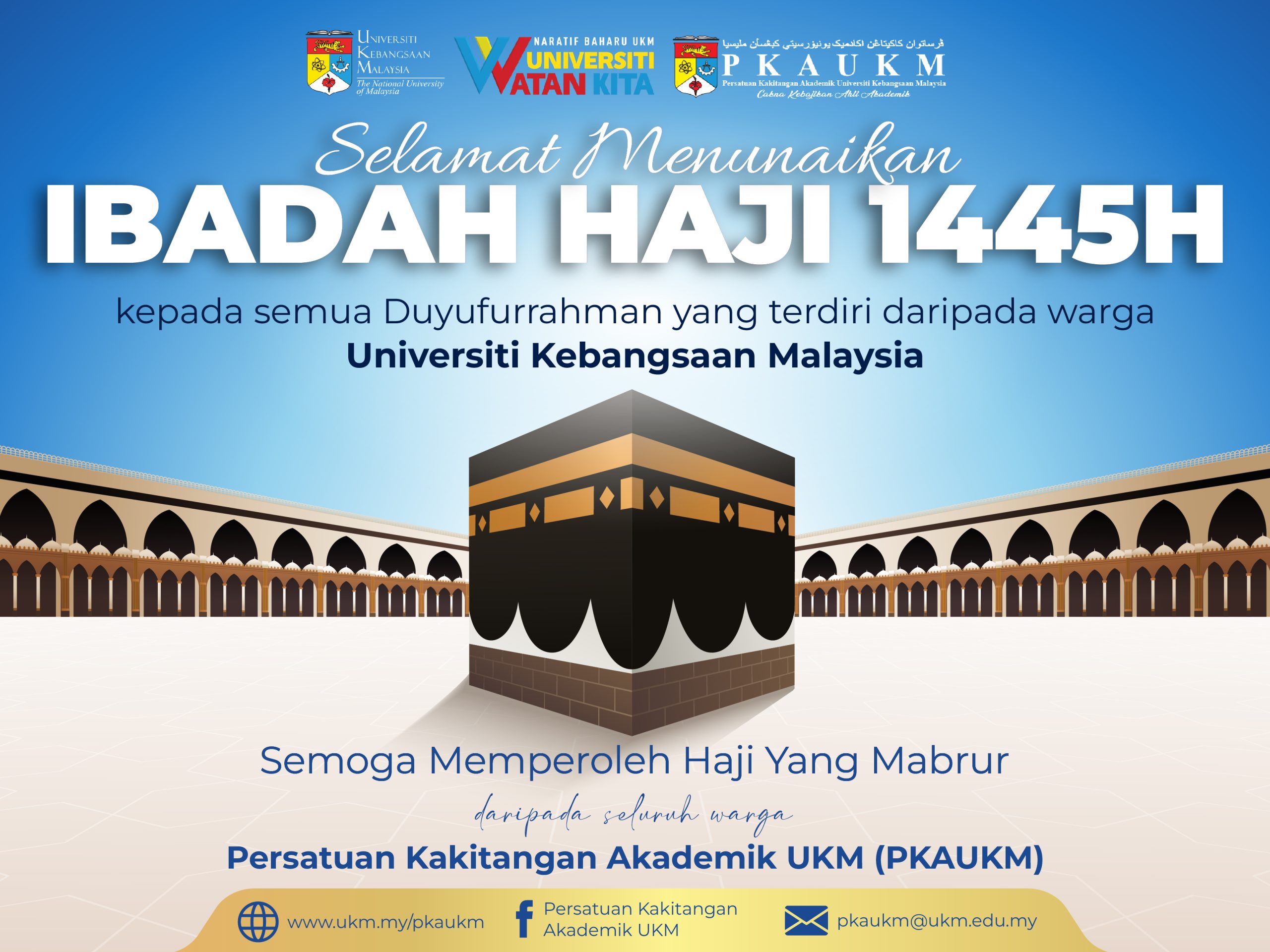 Persatuan Kakitangan Akademik UKM (PKAUKM) mengucapkan Selamat berangkat ke Tanah Suci dan Selamat Menunaikan Ibadat Haji sesi 1445H/ 2024M kepada semua Duyufurrahman dalam kalangan warga Universiti Kebangsaan Malaysia serta seluruh Malaysia.
