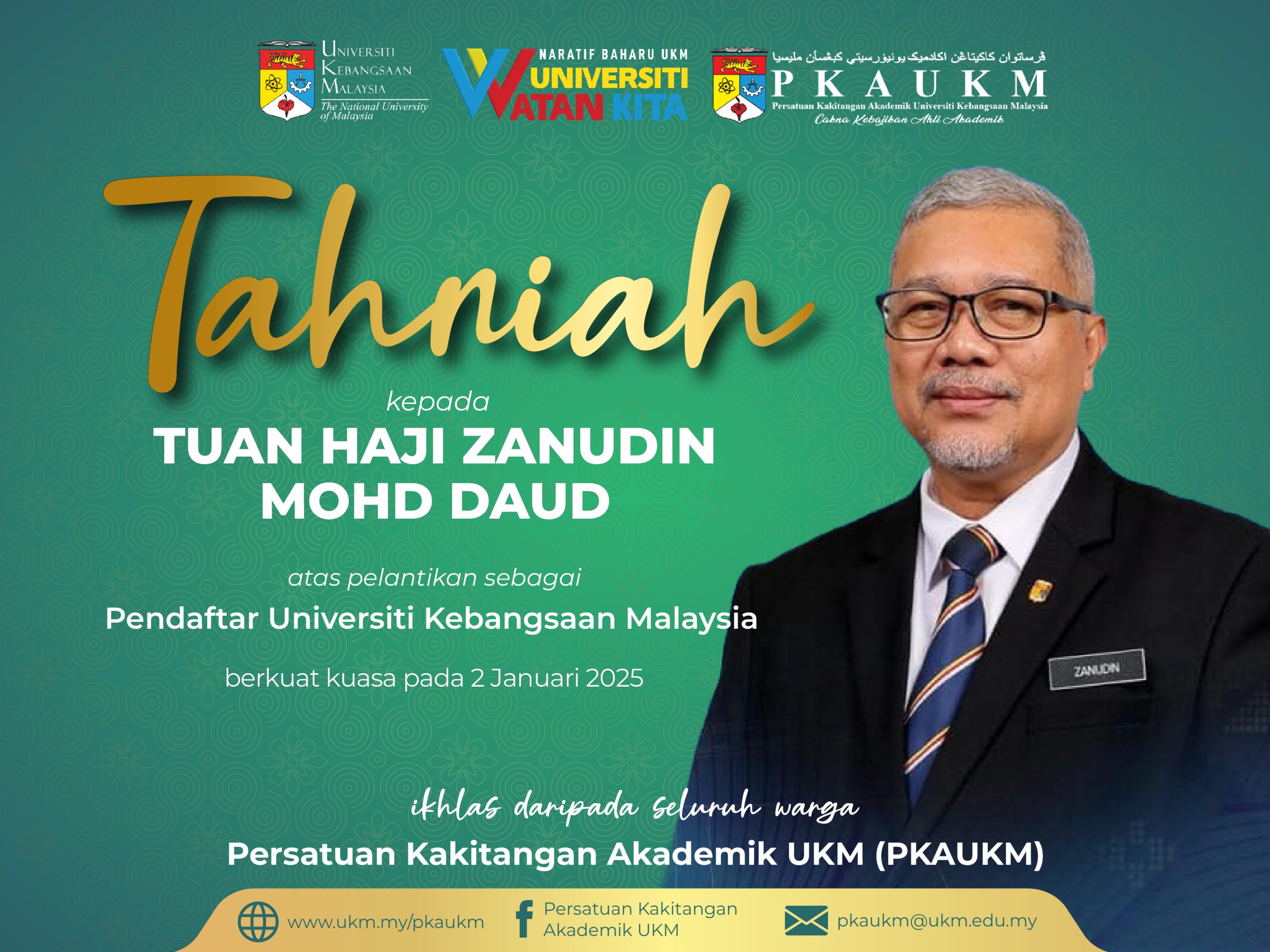 Tahniah Atas Pelantikan Sebagai Pendaftar UKM Tahniah diucapkan kepada Tuan Haji Zanudin Mohd Daud atas pelantikan sebagai Pendaftar UKM berkuatkuasa 2 Januari 2025. daripada Persatuan Kakitangan Akademik UKM (PKAUKM) #pkaukm #ukm #caknakebajikanahliakademik