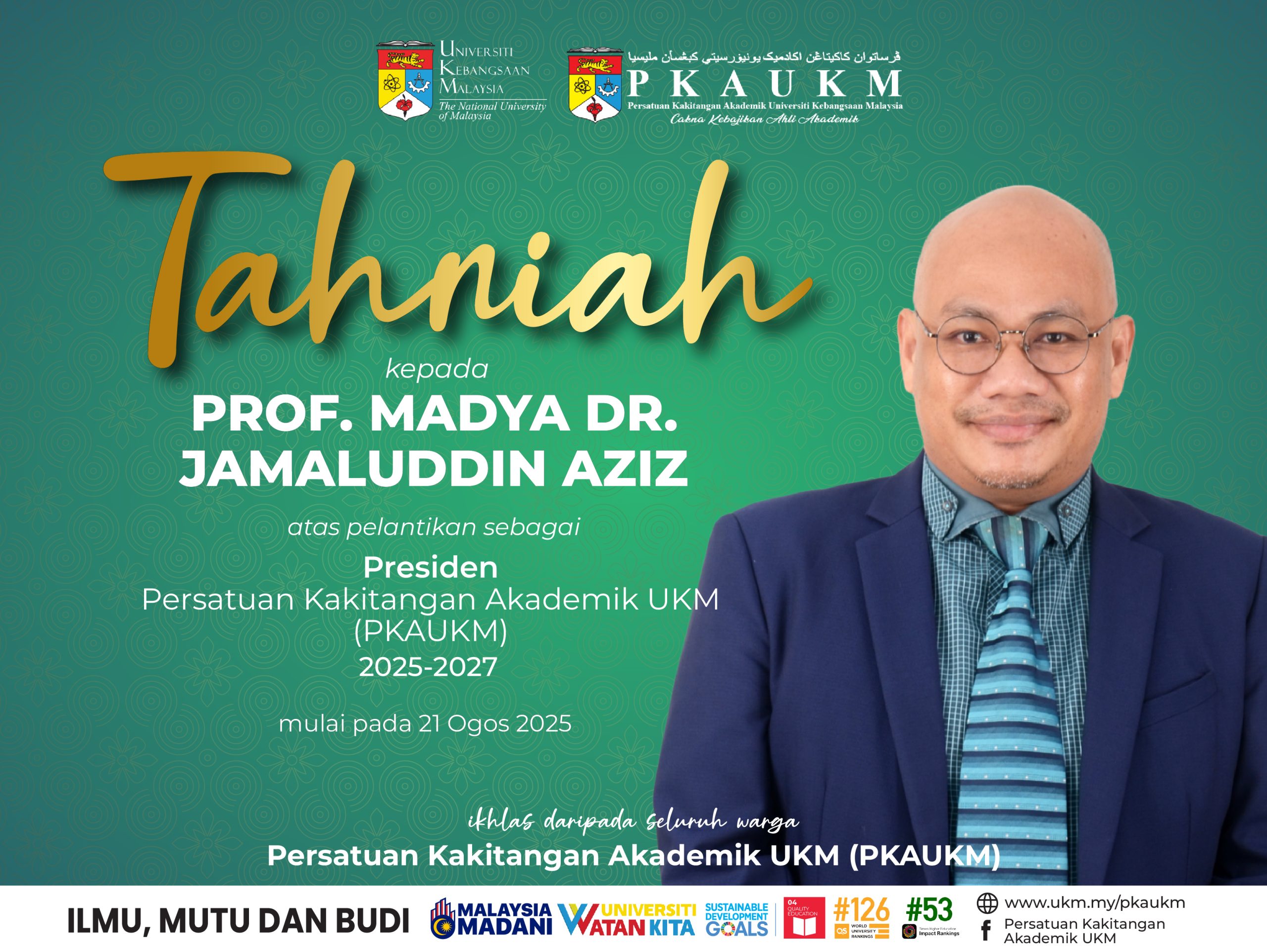 Tahniah Atas Pelantikan Sebagai Presiden PKAUKM Tahniah kepada Prof. Madya Dr. Jamaluddin Aziz atas pelantikan sebagai PRESIDEN Persatuan Kakitangan Akademik UKM (PKAUKM) yang baharu mulai 21 Ogos 2025 hingga 20 Ogos 2027. #pkaukm #ukm #caknakebajikanahliakademik