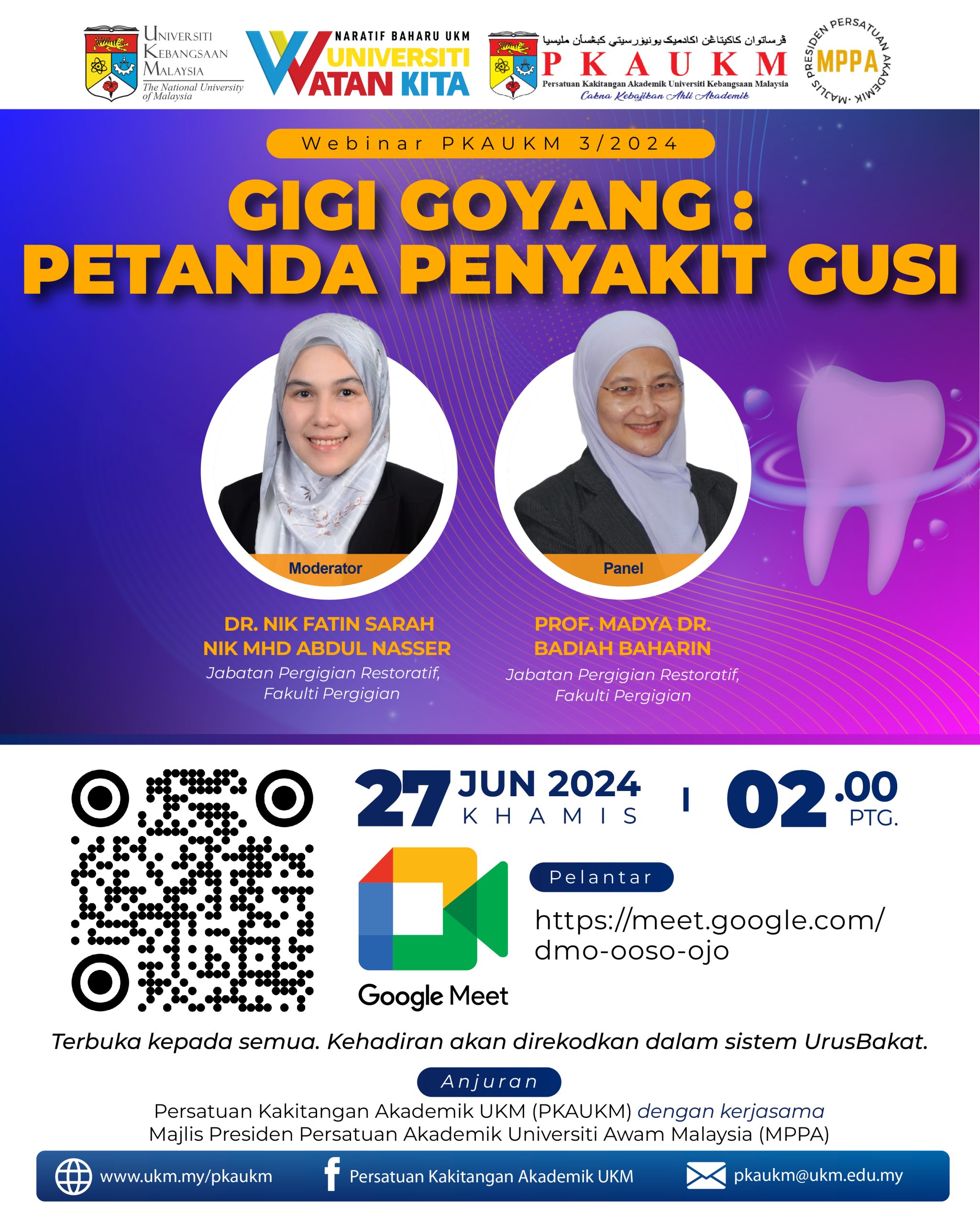 Persatuan Kakitangan Akademik UKM (PKAUKM) dengan kerjasama Majlis Presiden Persatuan Akademik Universiti Awam Malaysia (MPPA) akan mengadakan Webinar PKAUKM Siri 3/2024 – Gigi Goyang : Petanda Penyakit Gusi.