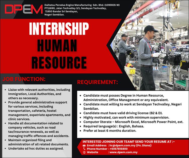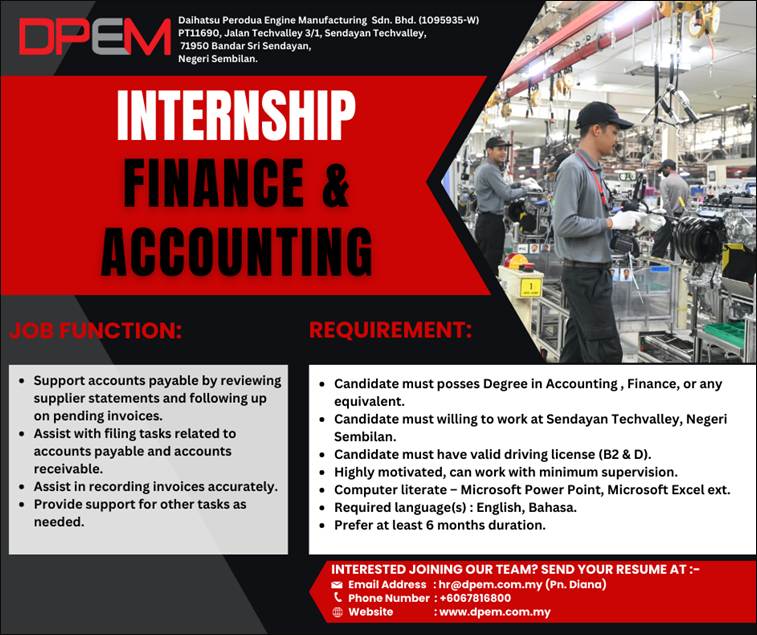 - Business & Admin, Engineering, Finance, CGPA 3.00 and above, Basic understanding labour law, proficient in microsoft office, Basic Accounting Knowledge,Understanding of relevant engineering principles