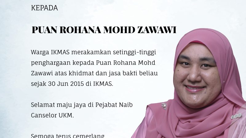 Warga IKMAS merakamkan setinggi-tinggi penghargaan kepada Puan Rohana Mohd Zawawi atas khidmat dan jasa bakti beliau sejak 30 Jun 2015 di IKMAS, dan selamat maju …