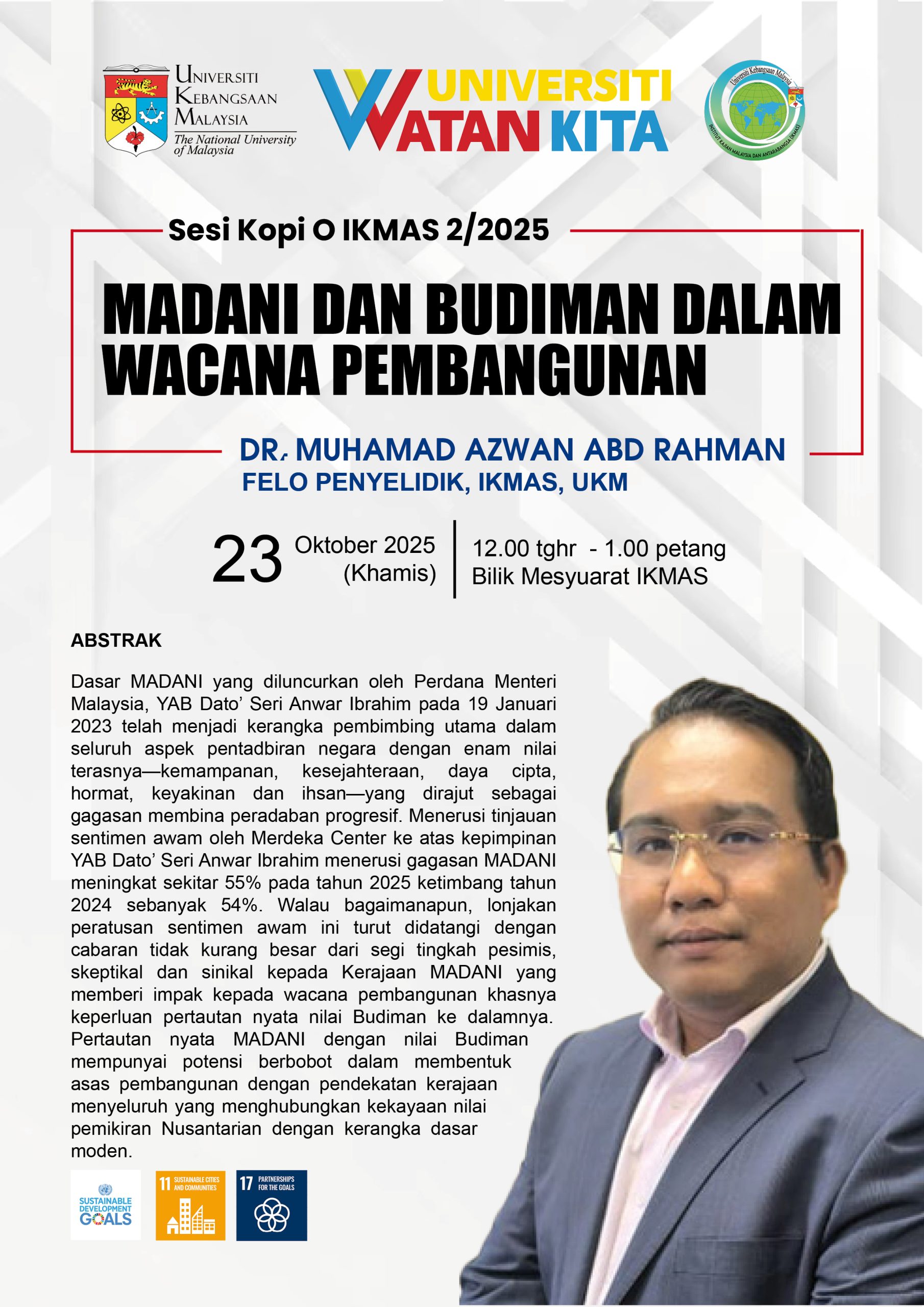 Sesi Kopi O IKMAS 2/2025 MADANI dan Budiman dalam Wacana Pembangunan Dr Muhamad Azwan Abd Rahman FeloPenyelidik IKMAS Tarikh: 23 Oktober 2025 Masa: 12 tengahari Tempat: Bilik Mesyuarat IKMAS