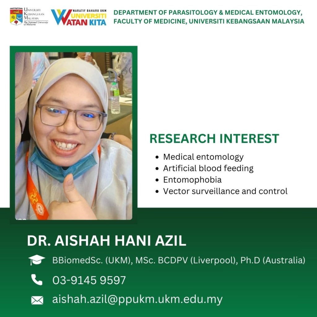 Dr. Aishah Hani Azil is a senior lecturer at the Department of Parasitology & Medical Entomology, Faculty of Medicine, UKM with over 15 years of teaching experience in the field of medical entomology and parasitology. She has been involved in dengue vector research since he was a master’s student at UKM until her MSc (Liverpool) and Ph.D (UniSA). Her latest research includes mosquito-borne diseases surveillance, vector control, Wolbachia-infected mosquitoes and oviposition attractants for Aedes. She has also written many articles in newspapers, magazines and virtual education portals.