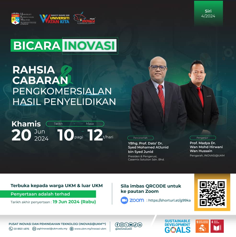The Innovation & Technology Transfer Center (INOVASI@UKM™) would like to invite to the INNOVATION TALK 4/2024 program: SECRETS AND CHALLENGES OF COMMERCIALIZATION OF RESEARCH RESULTS.