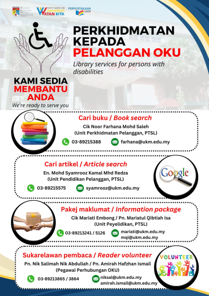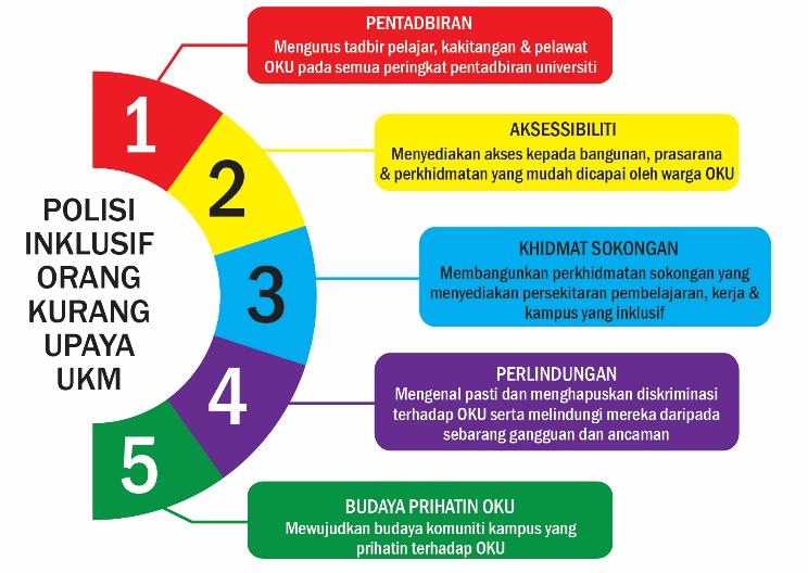 This unit was operated by referring to the Guidelines for Implementation of Disability Inclusive Policy in Higher Education Institutions (Garis Panduan Pelaksanaan Dasar Inklusif Orang Kurang Upaya di Institut Pendidikan Tinggi by Ministry of Higher Education (MOHE), Strategic Planning for Disability Inclusive Policy 2019-2023 and UKM’s Strategic Planning (TERAS) 2021-2025.