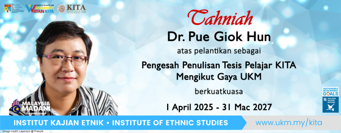 Seluruh warga Institut Kajian Etnik (KITA), UKM mengucapkan syabas dan tahniah buat Felo Penyelidik KITA Dr. Pue Giok Hun atas pelantikan sebagai Pengesah Penulisan Tesis Pelajar KITA Mengikut Gaya UKM berkuat kuasa dari 1 April 2025 hingga 31 Mac 2027.