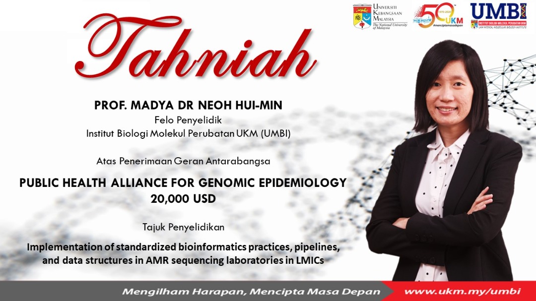 Tahniah Prof. Madya Dr Neoh Hui-Min, Felo Penyelidik, Institut Biologi Molekul Perubatan UKM (UMBI) atas penerimaan Geran Antarabangsa Public Health Alliance For Genomic Epidemiology berjumlah USD 20,000 dengan tajuk penyelidikan “Implementation of standardized bioinformatics practices, pipelines, and data structures in AMR sequencing laboratories in LMICs.”
