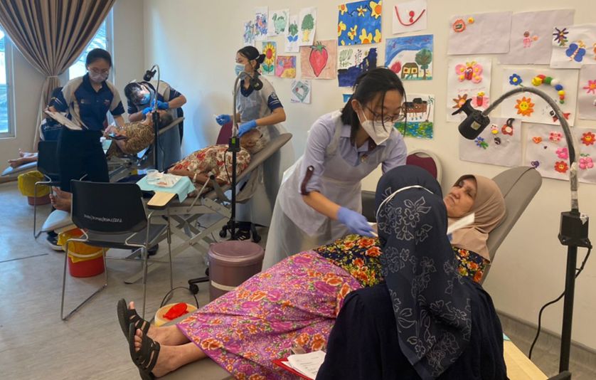 The Program Kesihatan Mulut Komuniti (Community Oral Health Program) is a key part of the Year 5 curriculum at UKM, providing dental students with real-world experience beyond the classroom. Students deliver oral health services to senior citizens at the Pusat Jagaan Mahmudah, Pusat Aktiviti Warga Emas (PAWE) UKM Bangi, and Persatuan Warga Emas Kg. Sg. Tua, Batu Caves. Activities include dental check-ups, oral hygiene education, and preventive care. This program enhances students' clinical skills while fostering empathy and understanding of the importance of community service in healthcare, preparing them to become compassionate dental professionals.