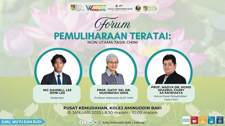 Pada 15 Januari 2025 (Rabu), Kolej Aminuddin Baki (KAB) telah menganjurkan Forum Pemuliharaan Teratai: Ikon Utama Tasik Chini dengan menampilkan Prof. Dato’ Seri Dr. Mushrifah Idris, Profesor Kehormat, ALAF-UKM dan Prof. Madya Dr. Mohd Shazrul Fazry Sa’ariwijaya, Ketua Makmal Pusat Penyelidikan Tasik Chini (PPTC), ALAF-UKM bertempat di Pusat Kemudahan, KAB.Forum ini bertujuan untuk mengupas mengenai […]