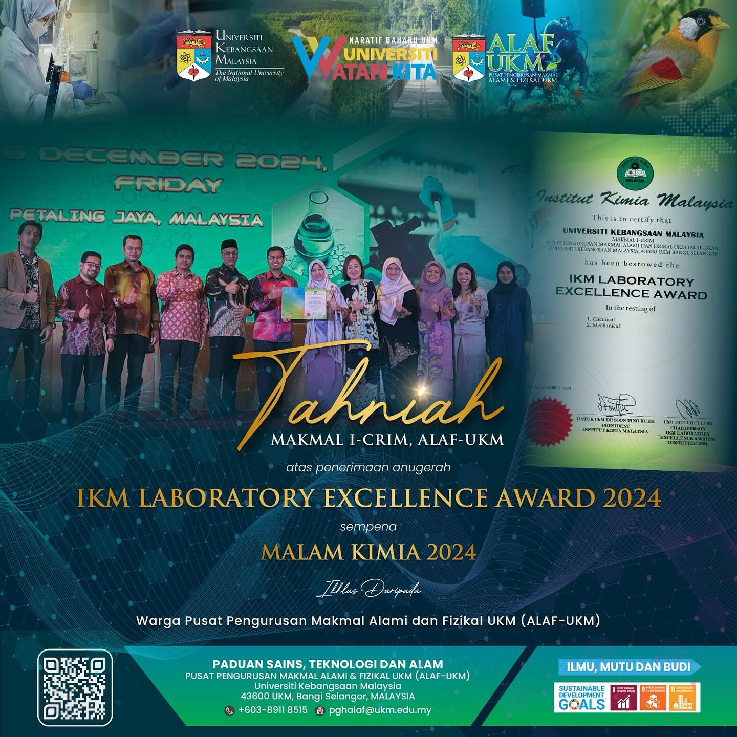 Warga ALAF-UKM mengucapkan setinggi-tinggi tahniah kepada Makmal Instrumentasi Berpusat UKM (Makmal i-CRIM) atas kejayaan cemerlang menerima “IKM Laboratory Excellence Award 2024” daripada Institut Kimia Malaysia (IKM) bersempena Majlis Malam Kimia & Presentation of IKM Awards 2024 pada Jumaat 6 Disember 2024.Pengiktirafan ini sekali lagi membuktikan kecemerlangan perkhidmatan Makmal i-CRIM dalam dua bidang utama, iaitu ‘Mechanical […]