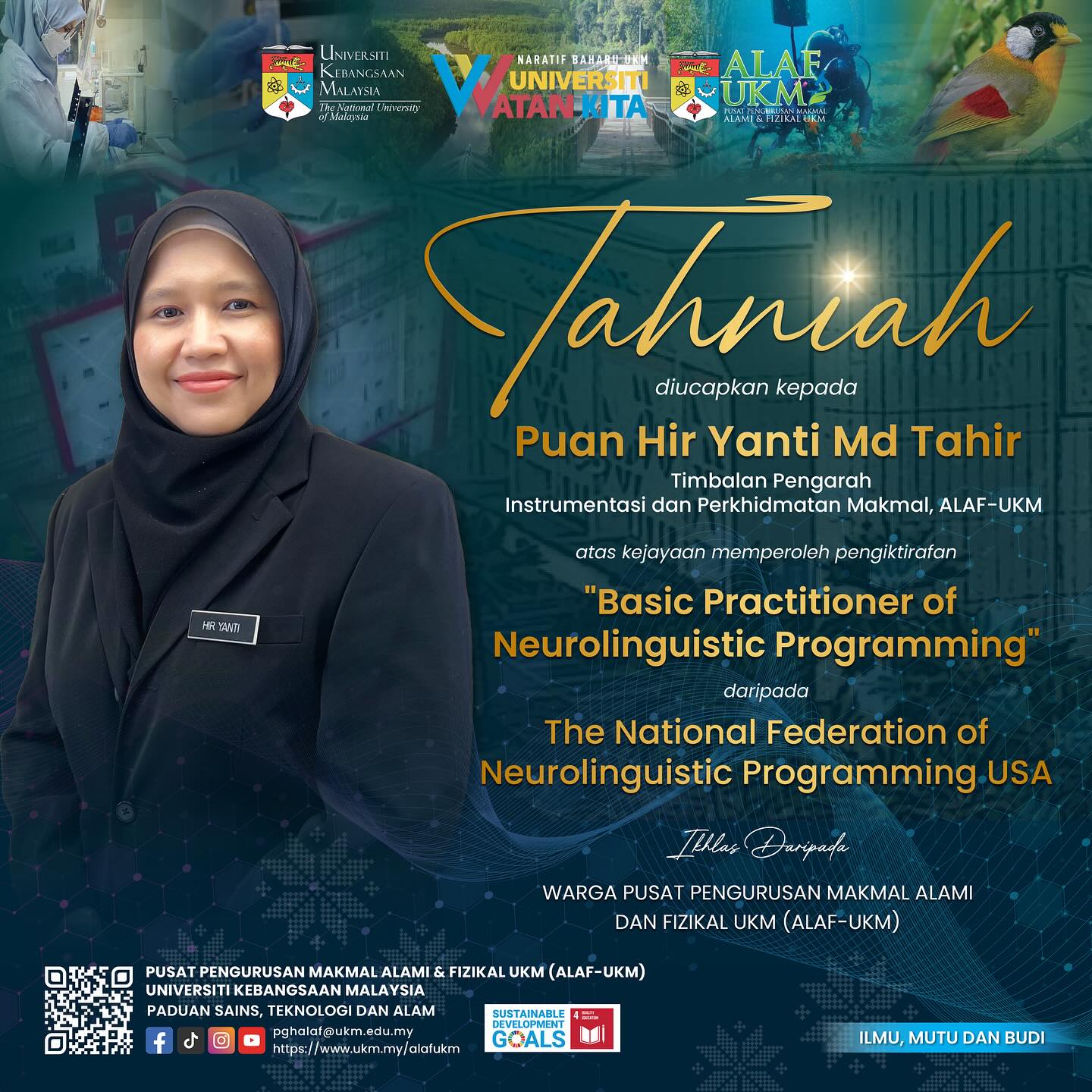 Warga ALAF-UKM mengucapkan setinggi-tinggi tahniah kepada Puan Hir Yanti Md Tahir, Timbalan Pengarah Instrumentasi dan Perkhidmatan Makmal, ALAF-UKM atas kejayaan memperoleh pengiktirafan sebagai “????? ???????????? ?? ??????????????? ???????????” daripada The National Federation of Neurolinguistic Programming USA.Semoga pengiktirafan ini menjadi inspirasi kepada seluruh warga ALAF-UKM untuk memperkukuh serta mempertingkatkan kecemerlangan akademik dan profesionalisme diri seterusnya memacu […]