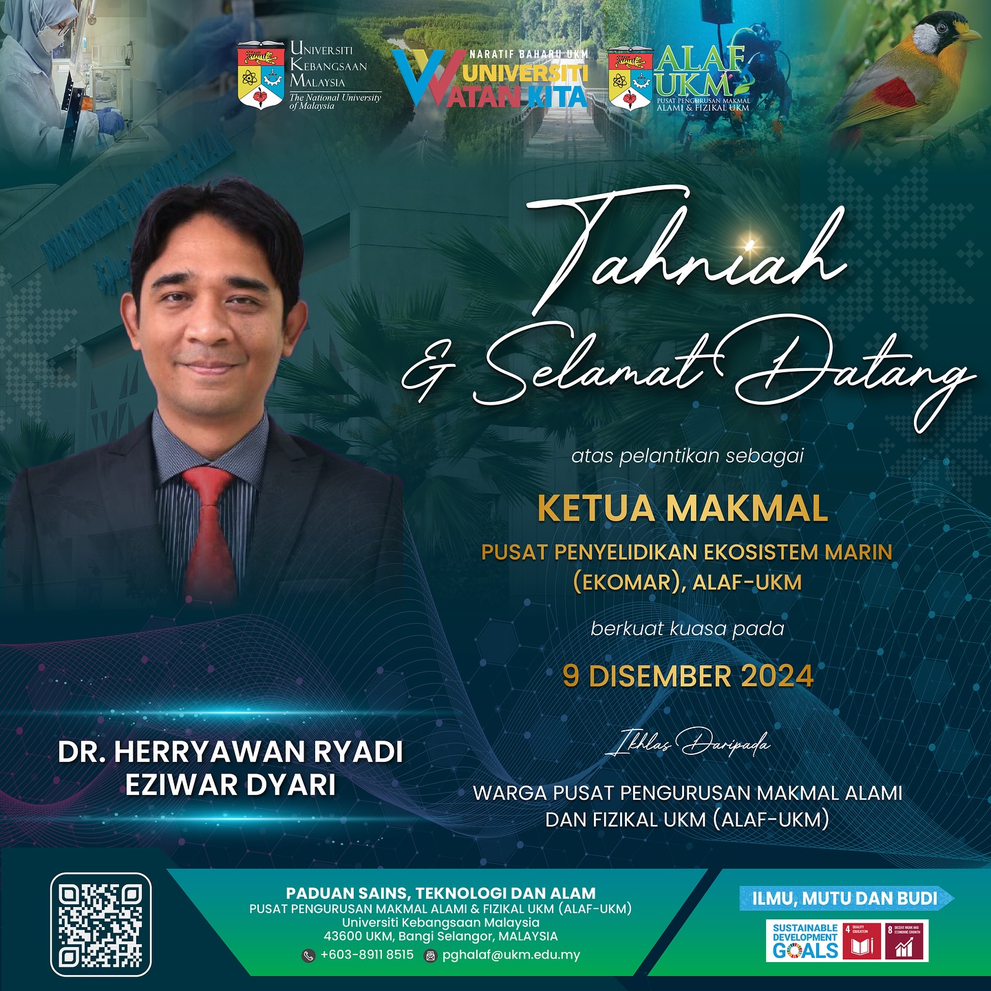 Setinggi-tinggi tahniah diucapkan kepada Dr. Herryawan Ryadi Eziwar Dyari atas pelantikan beliau sebagai Ketua Makmal Pusat Penyelidikan Ekosistem Marin (EKOMAR), ALAF-UKM, berkuat kuasa mulai 9 Disember 2024.Semoga dengan kehadiran Dr. Herryawan Ryadi dapat meningkatkan potensi dan khidmat ALAF-UKM dengan lebih cemerlang.??????? ????????!