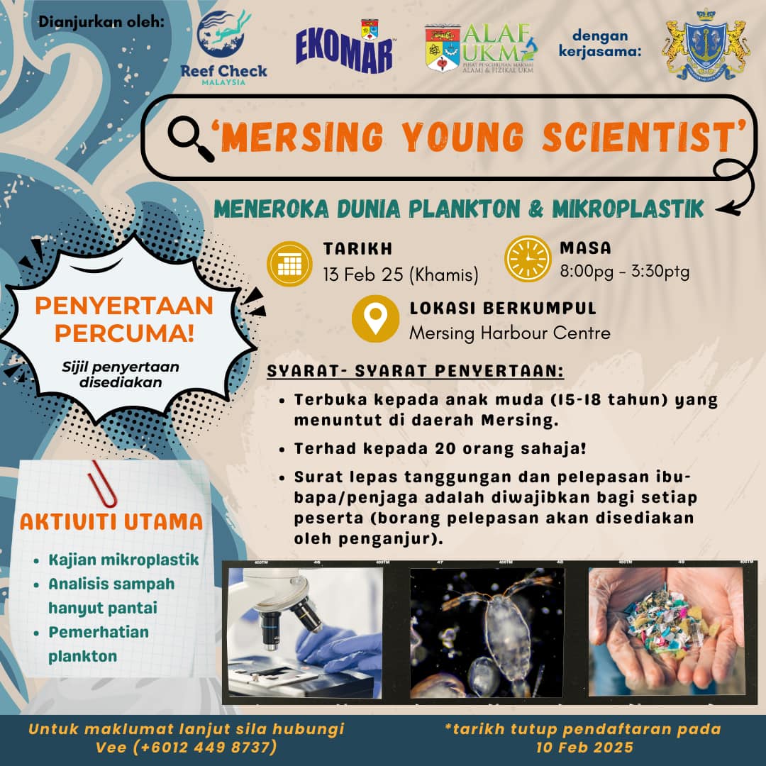 Pusat Penyelidikan Ekosistem Marin (EKOMAR), ALAF-UKM bersama Reef Check Malaysia dengan kerjasama Majlis Daerah Mersing akan menganjurkan Program Mersing Young Scientist 2025 yang bertujuan menyediakan platform khas kepada generasi muda mengeksplorasi ilmu sains marin secara interaktif. Tarikh: 13 Februari 2025 Lokasi: EKOMAR, ALAF-UKM Penyertaan terhad: 20 orang sahajaAntara aktiviti menarik yang disediakan adalah:Kajian mikroplastik di […]