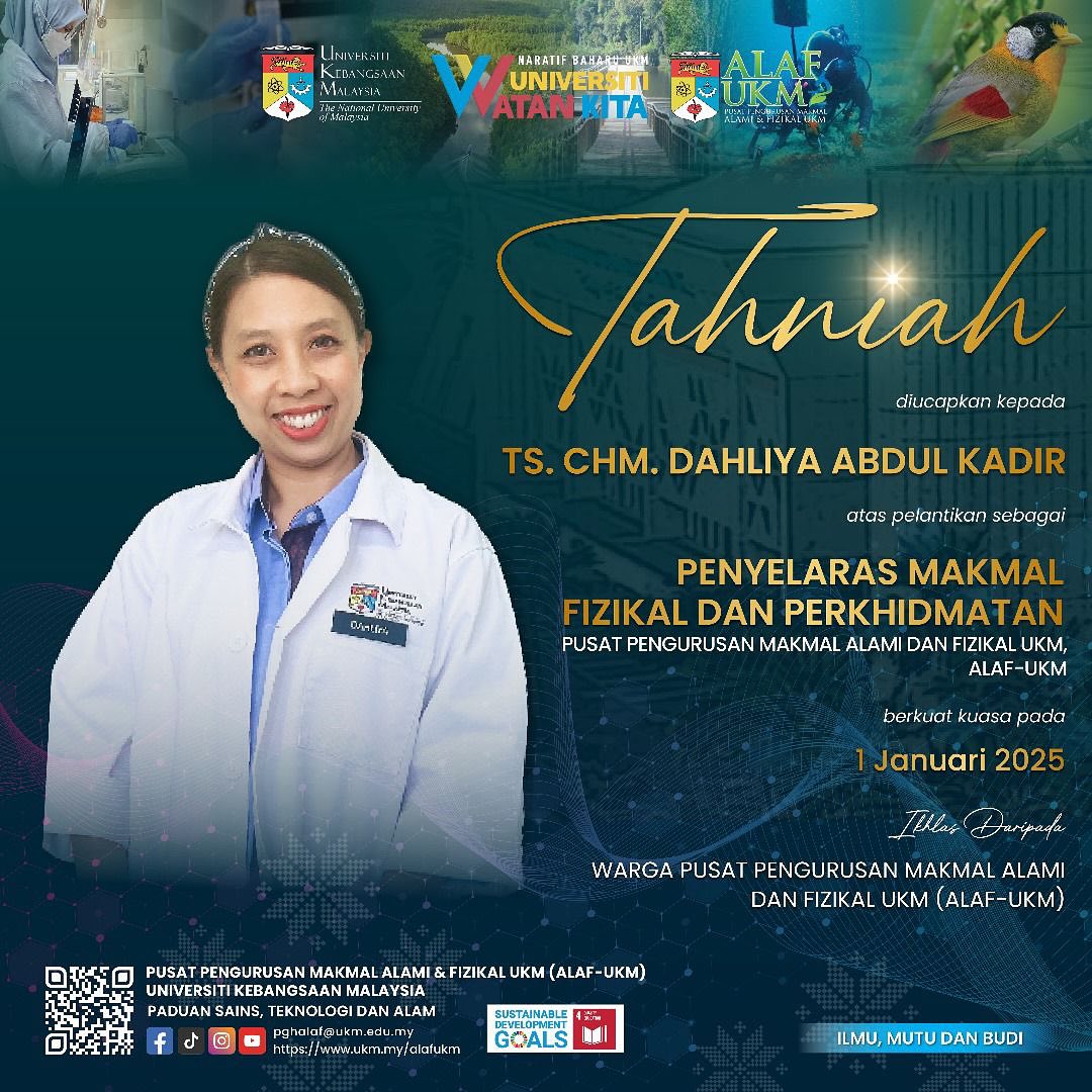 Warga ALAF-UKM mengucapkan setinggi-tinggi tahniah kepada Ts. ChM. Dahliya Abdul Kadir, Pegawai Sains C10 atas pelantikan sebagai Penyelaras Makmal Fizikal dan Perkhidmatan ALAF-UKM, berkuat kuasa 1 Januari 2025.Semoga amanah dan tanggungjawab ini dapat dipikul dengan penuh dedikasi, seterusnya memacu kecemerlangan perkhidmatan dan pengurusan Makmal FIzikal ALAF-UKM ke tahap yang lebih tinggi seterusnya menyumbang kepada kecemerlangan […]