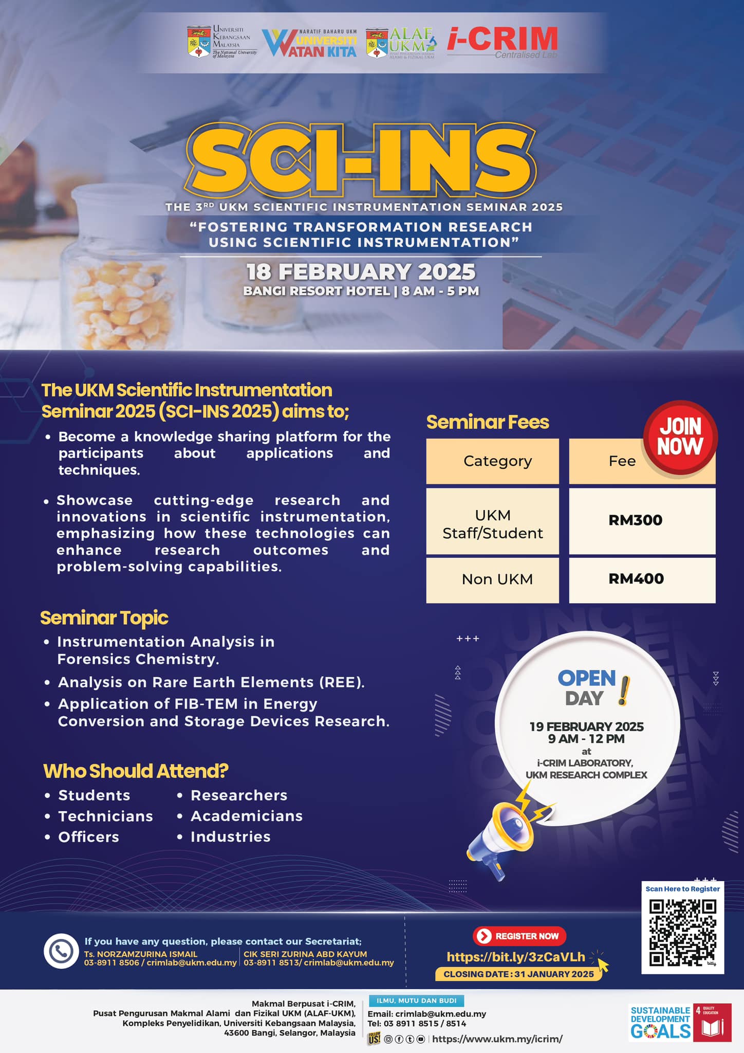 Makmal i-CRIM, Pusat Pengurusan Makmal Alami dan Fizikal (ALAF-UKM) akan menganjurkan SCI-INS THE 3rd INSTRUMENTATION SEMINAR 2025 seperti butiran berikut; Tarikh: 18 Februari 2025 (Selasa)Masa: 8.00 pagi – 5.00 petang Tempat: Bangi Resort Hotel, Bangi. Seminar ini menyasarkan semua staf, pensyarah, penyelidik, pelajar dan industri untuk hadir bersama menyertai pembentangan, perbincangan dan peluang memperluaskan jaringan […]