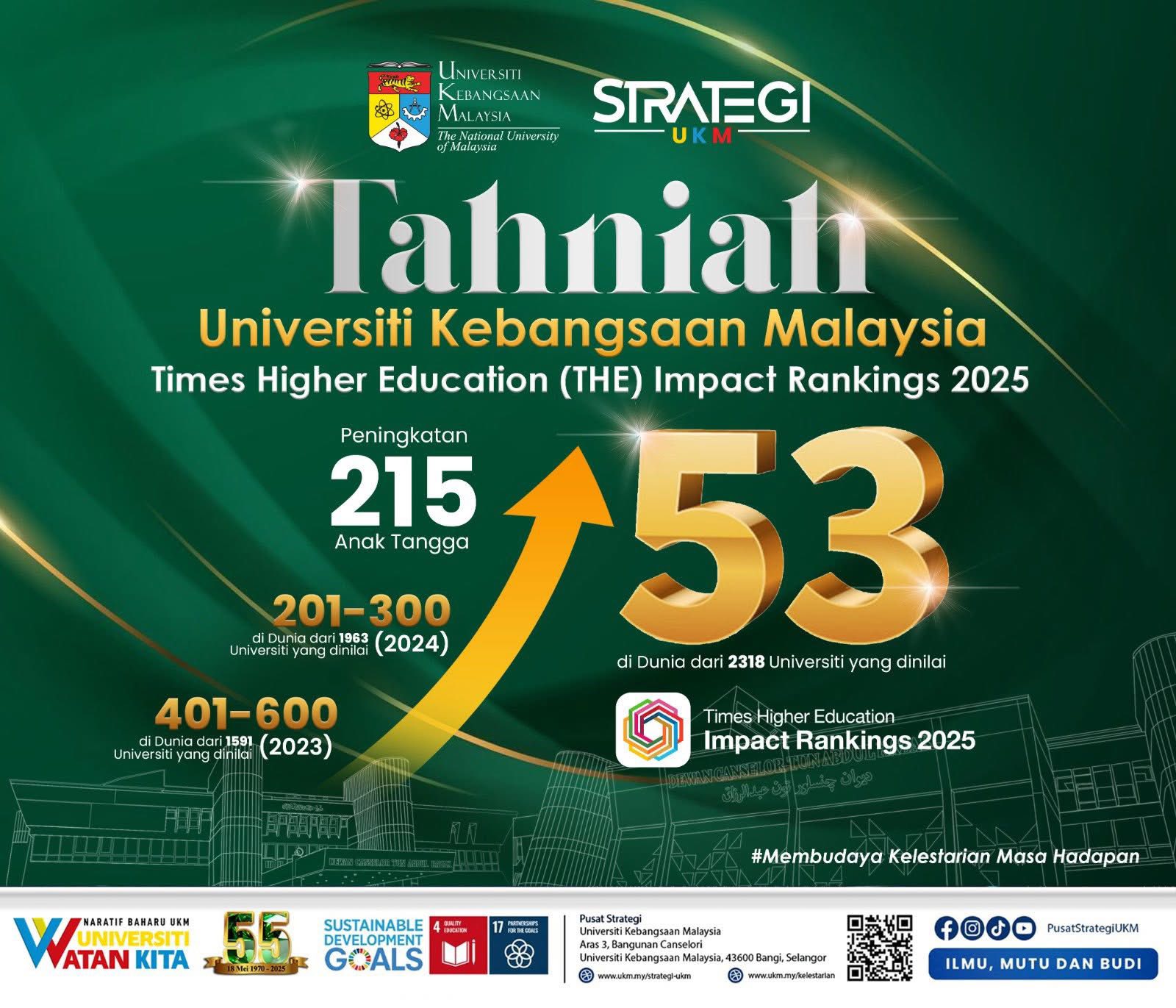 Universiti Kebangsaan Malaysia (UKM) mencatat lonjakan sebanyak 215 anak tangga ke kedudukan ke-53 dunia daripada kedudukan 201–300 pada tahun sebelumnya dalam penarafan Times Higher Education (THE) Impact Rankings 2025.Penarafan Impak THE menilai komitmen institusi terhadap 17 Matlamat Pembangunan Mampan (SDG) Pertubuhan Bangsa-Bangsa Bersatu melalui penyelidikan, pendidikan, jangkauan komuniti dan pengurusan kelestarian kampus.UKM membuktikan kecemerlangannya apabila […]