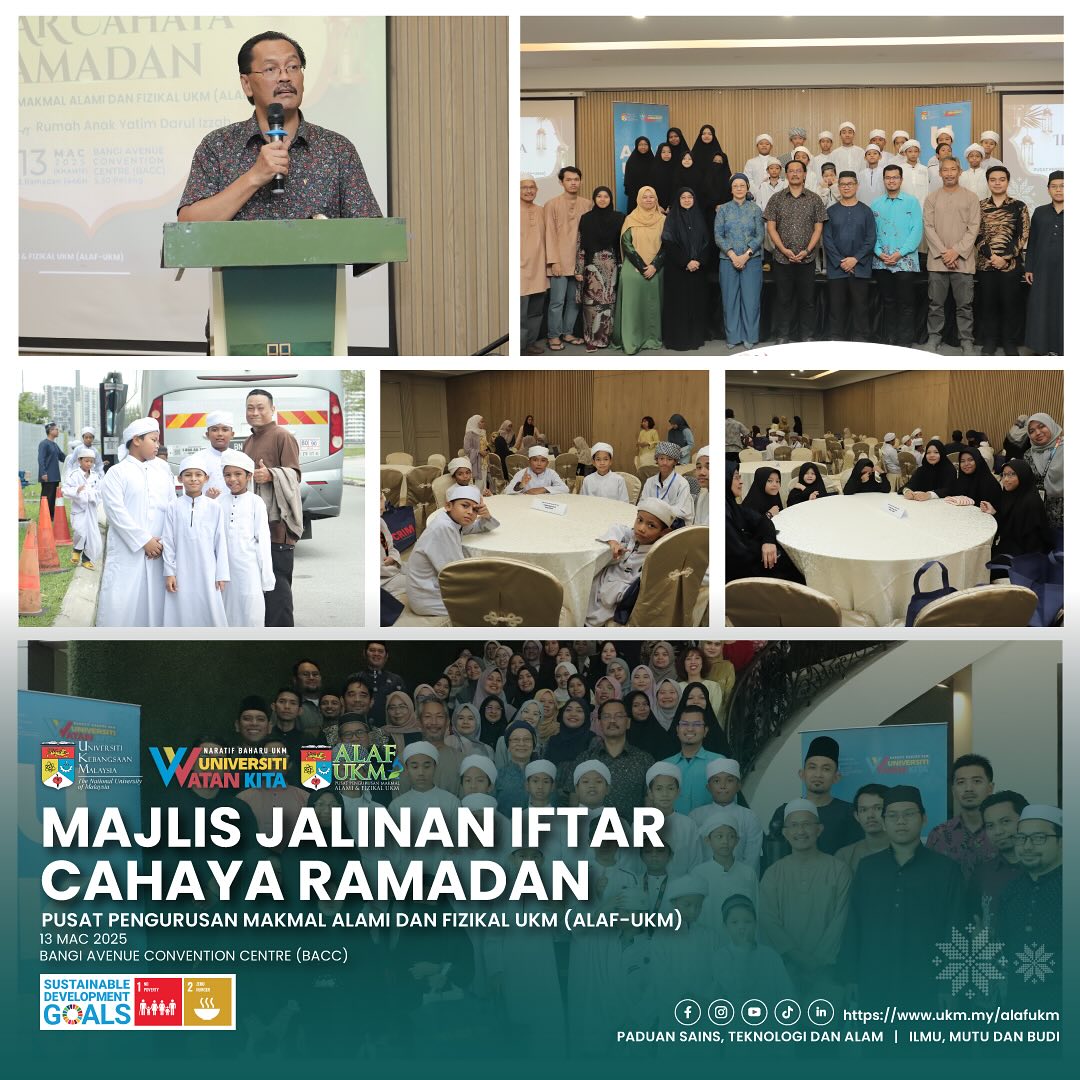 Pusat Pengurusan Makmal Alami dan Fizikal UKM (ALAF-UKM) telah menganjurkan Majlis Jalinan Iftar Cahaya Ramadan bertempat di Bangi Avenue Convention Centre (BACC) pada 13 Mac 2025. Seramai 21 orang anak yatim daripada Rumah Anak Yatim Darul Izzah Bangi diraikan dalam majlis ini sebagai tanda kebersamaan dan keprihatinan warga UKM kepada golongan yang memerlukan.Pada majlis tersebut, […]