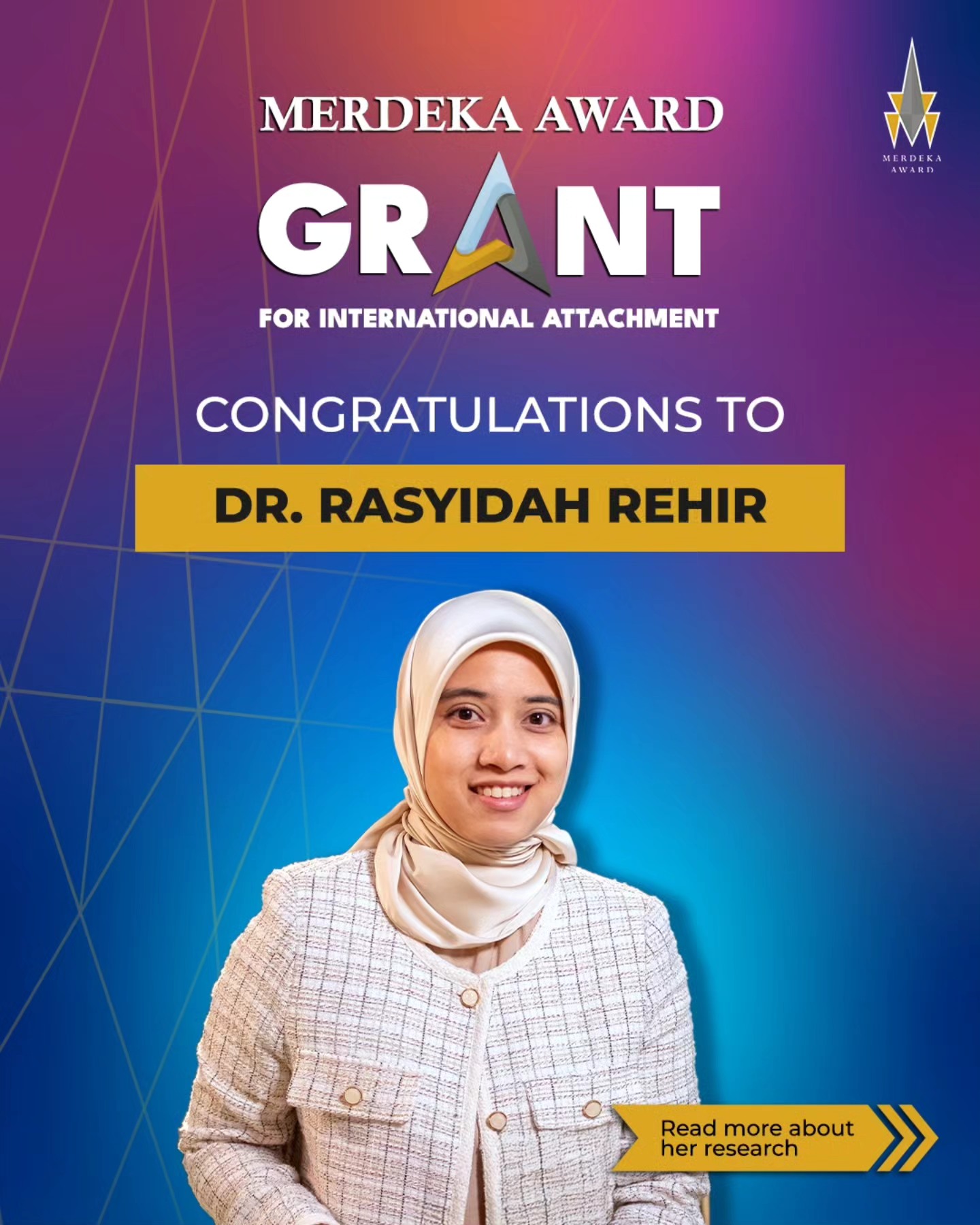 Congratulations to Dr. Rasyidah Rehir on being awarded the Merdeka Award Grant for International Attachment 2025, a prestigious recognition presented by the Merdeka Award Trust.