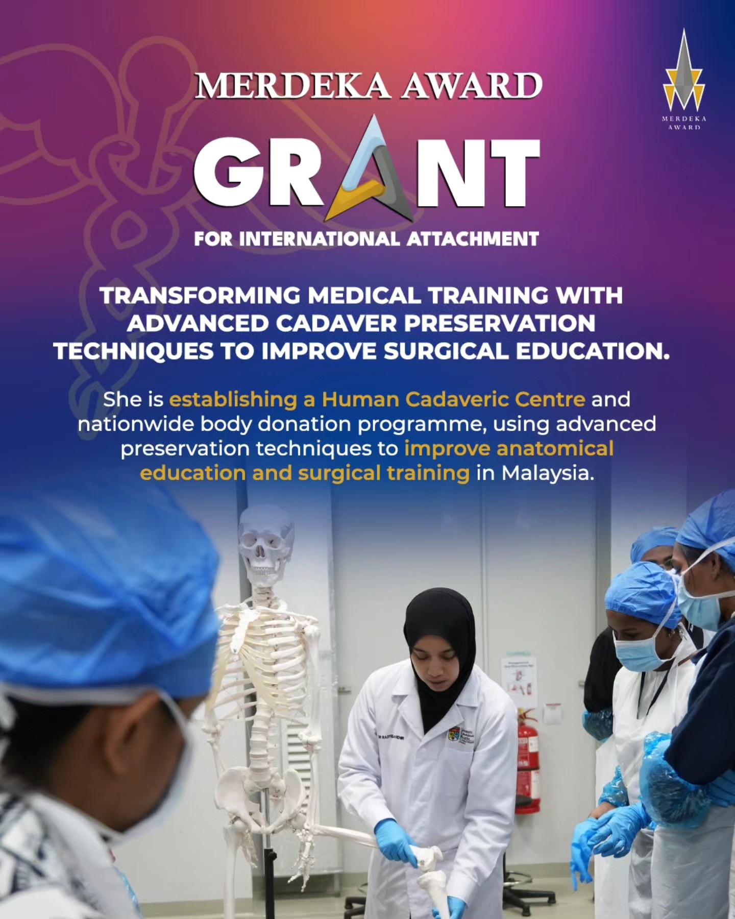 This selection acknowledges her commitment and dedication in advancing the field of cadaver preservation and research related to the Thiel Embalming Technique. Through this grant, Dr. Rasyidah plans to undergo attachments at several world-renowned institutions, including the University of Dundee (UK), the University of Graz (Austria), as well as several countries in Asia to further enhance her expertise in modern preservation techniques.