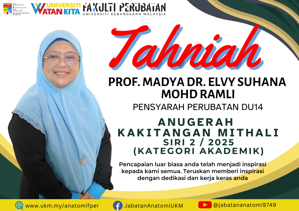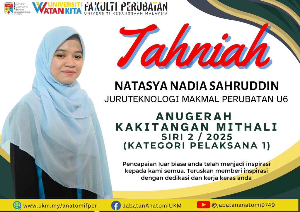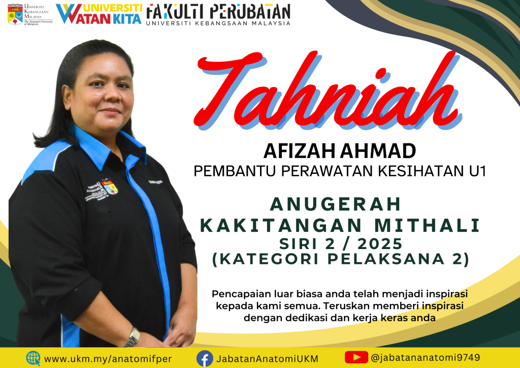 Jabatan Anatomi merakamkan setinggi-tinggi tahniah kepada para penerima Anugerah Kakitangan Mithali Siri 2/2025 yang telah berlangsung dengan jayanya pada 10 Februari 2026 bertempat di Bilik Mesyuarat Jabatan Anatomi, Tingkat 18.