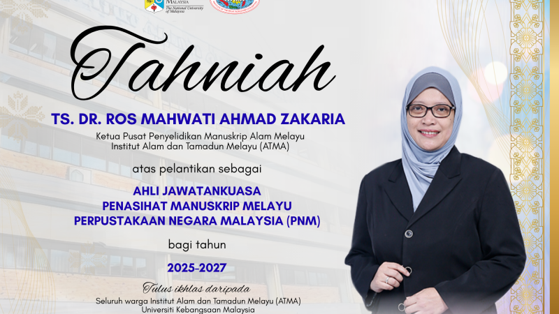 ?????? ??? ???????! Institut Alam dan Tamadun Melayu (ATMA), Universiti Kebangsaan Malaysia merakamkan ucapan setinggi-tinggi tahniah kepada Ts. Dr. Ros Mahwati Ahmad Zakaria (Ketua Pusat…