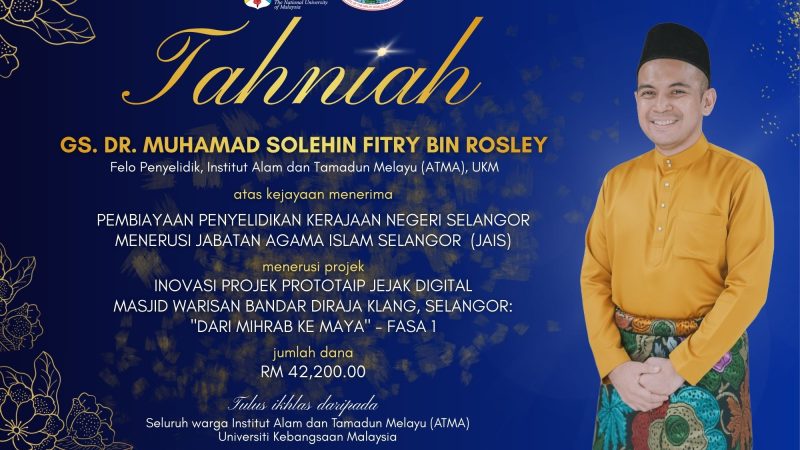 Tahniah diucapkan kepada GS. Dr. Muhamad Solehin Fitry atas kejayaan pembiayaan penyelidikan: Dari Mihrab ke Maya