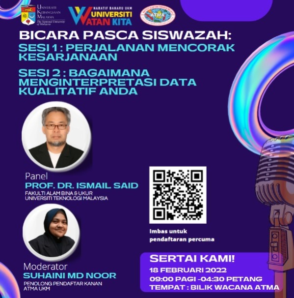 Bicara Pasca Siswazah ATMA yang akan disampaikan oleh Prof. Dr. Ismail Said. Sesi 1: Perjalanan Mencorak Kesarjanaan Sesi 2: Bagaimana Menginterpretasi Data Kualitatif Anda 18…