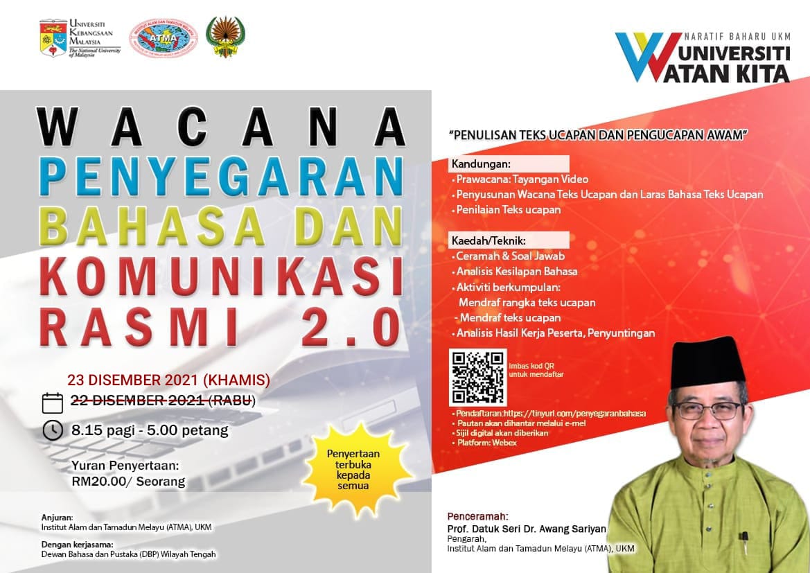 Undangan ke Wacana Penyegaran Bahasa & Komunikasi Rasmi 2.0. Institut Alam dan Tamadun Melayu (ATMA), UKM dengan kerjasama DBP Wilayah Tengah dengan hormatnya menjemput Tuan/Puan…