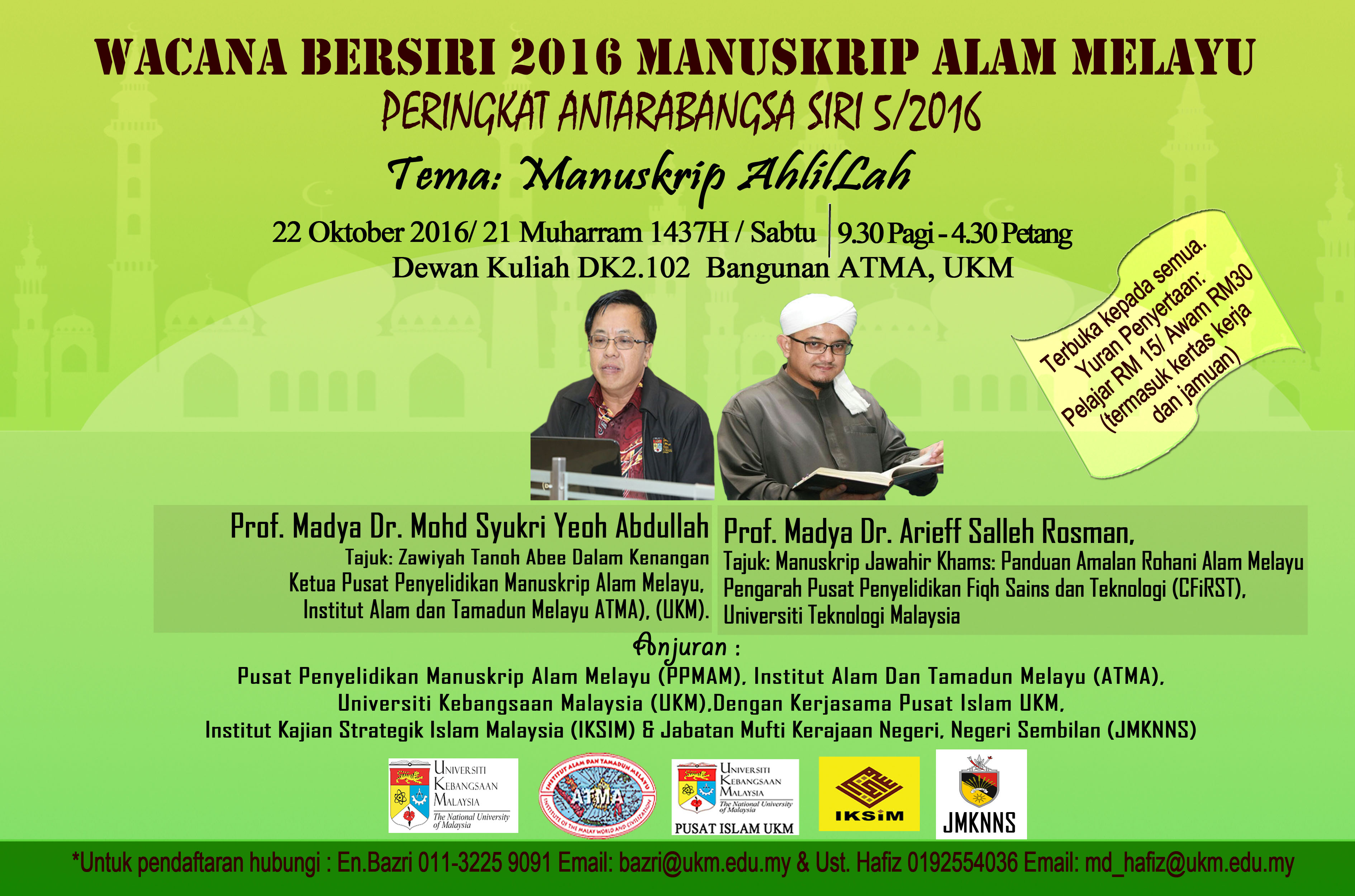 Sukacita di maklumkan bahawa pihak Pusat Penyelidikan Manuskrip Alam Melayu (PPMAM), Institut Alam dan Tamadun Melayu (ATMA), Universiti Kebangsaan Malaysia bekerjasama dengan Pusat Islam UKM dan IKSiM…