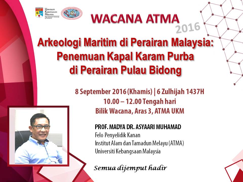Wacana ATMA: Siri September Tajuk Syarahan: ARKEOLOGI MARITIM DI PERAIRAN MALAYSIA: Penemuan Kapal Karam Purba di Perairan Pulau Bidong Oleh: Prof. Madya Dr. Asyaari…