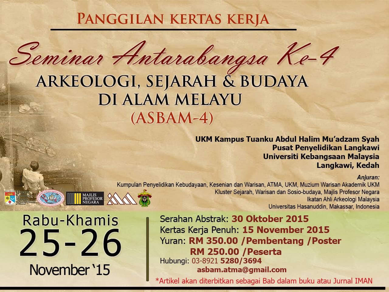 Kumpulan Penyelidikan Kebudayaan, Kesenian dan Warisan, ATMA UKM dengan kerjasama Muzium Warisan Akademik UKM dan Ikatan Ahli Arkeologi Malaysia akan menganjurkan SEMINAR ANTARABANGSA KE- 4, ARKEOLOGI,…