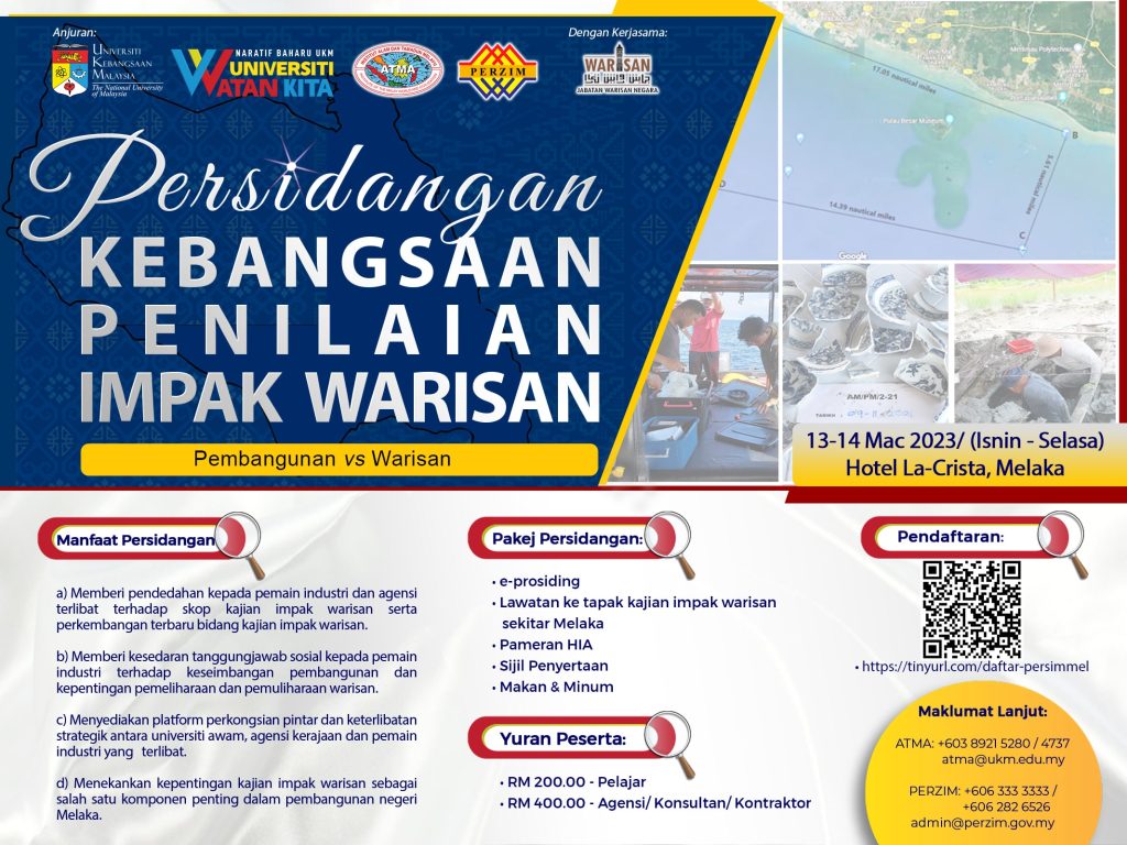 Institut Alam dan Tamadun Melayu (ATMA), UKM dan Perbadanan Muzium Melaka (PERZIM) akan menganjurkan Persidangan Kebangsaan Penilaian Impak Warisan pada 13 dan 14 Mac 2023.