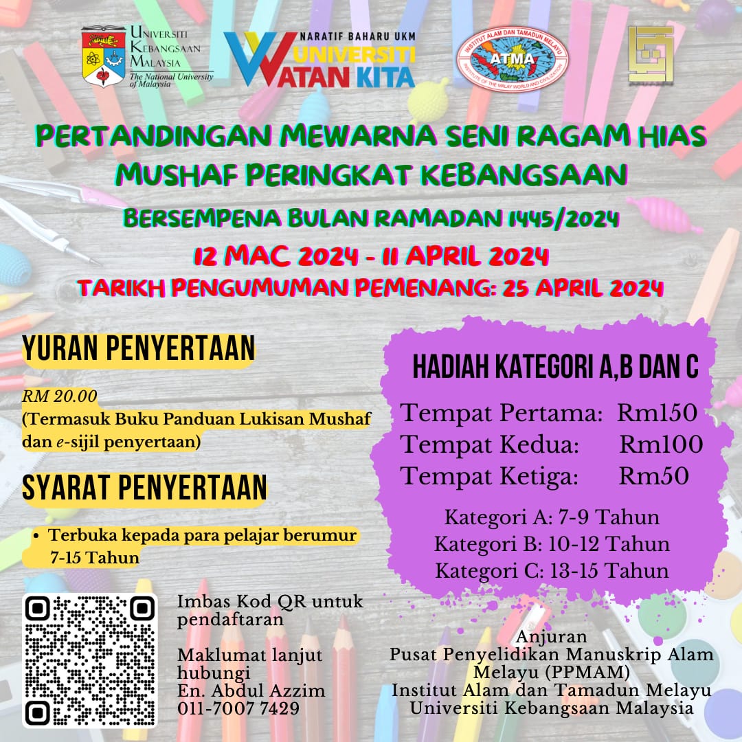 Dimaklumkan Pusat Penyelidikan Manuskrip Alam Melayu (PPMAM), Institut Alam dan Tamadun Melayu (ATMA), UKM akan menganjurkan Pertandingan Mewarna Seni Ragam Hias Mushaf Manuskrip Melayu peringkat kebangsaan bersempena dengan bulan Ramadan 1445H/2024 secara dalam talian.
