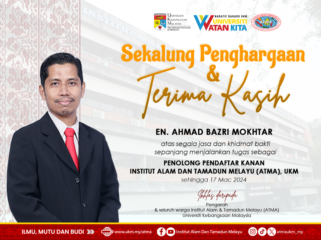 Sekalung penghargaan & terima kasih diucapkan kepada En. Ahmad Bazri Mokhtar, atas segala jasa dan khidmat bakti sepanjang menjalankan tugas sebagai Penolong Pendaftar Kanan di ATMA sehingga 17 Mac 2024.
