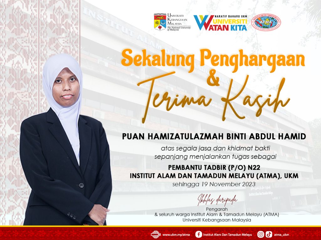 Sekalung Penghargaan & Terima Kasih Puan Hamizatulazmah binti Abdul Hamid, atas segala jasa dan khidmat bakti sepanjang menjalankan tugas sebagai Pembantu Tadbir (P/O) N22 di ATMA sehingga 19 November 2023.